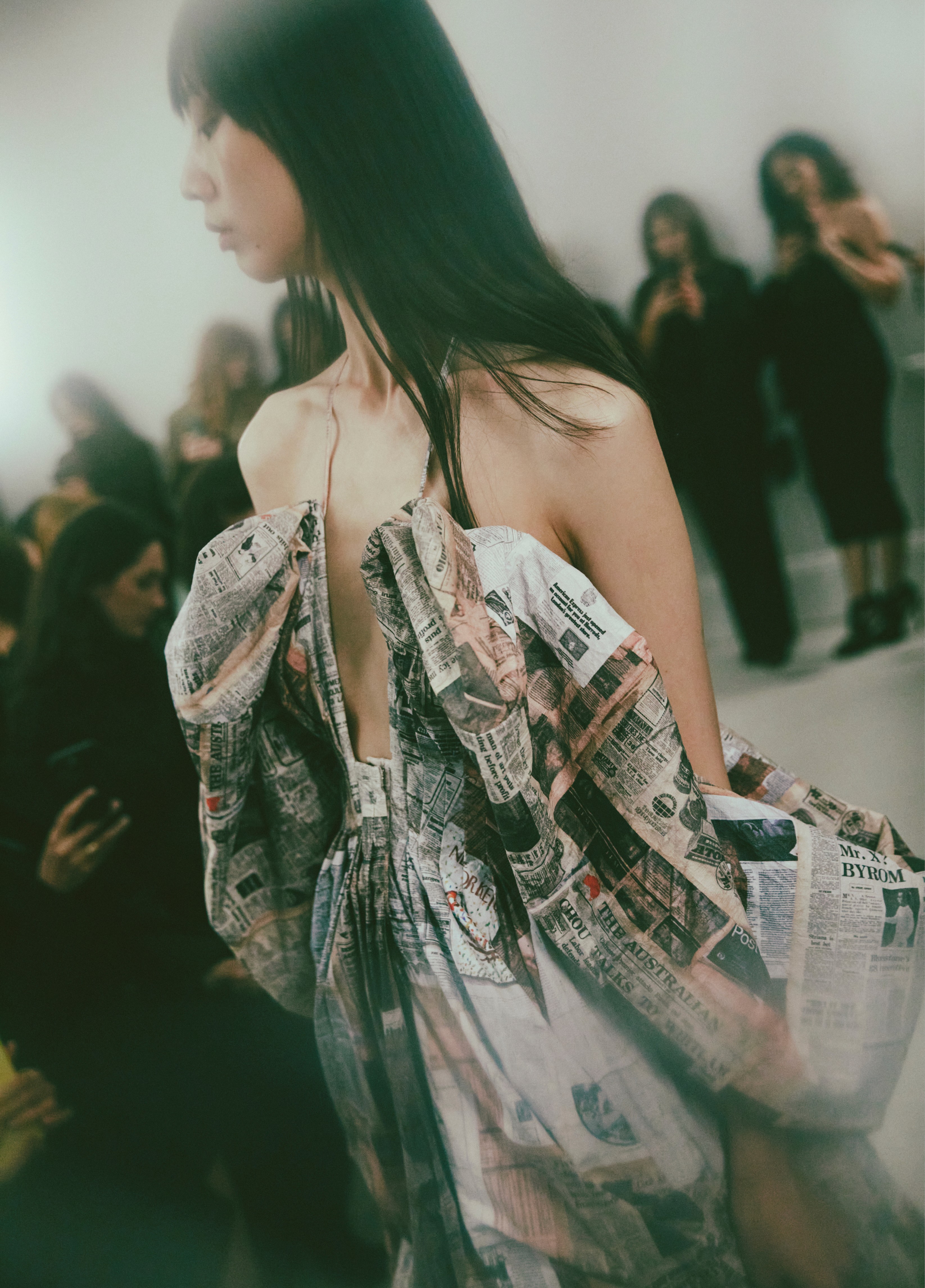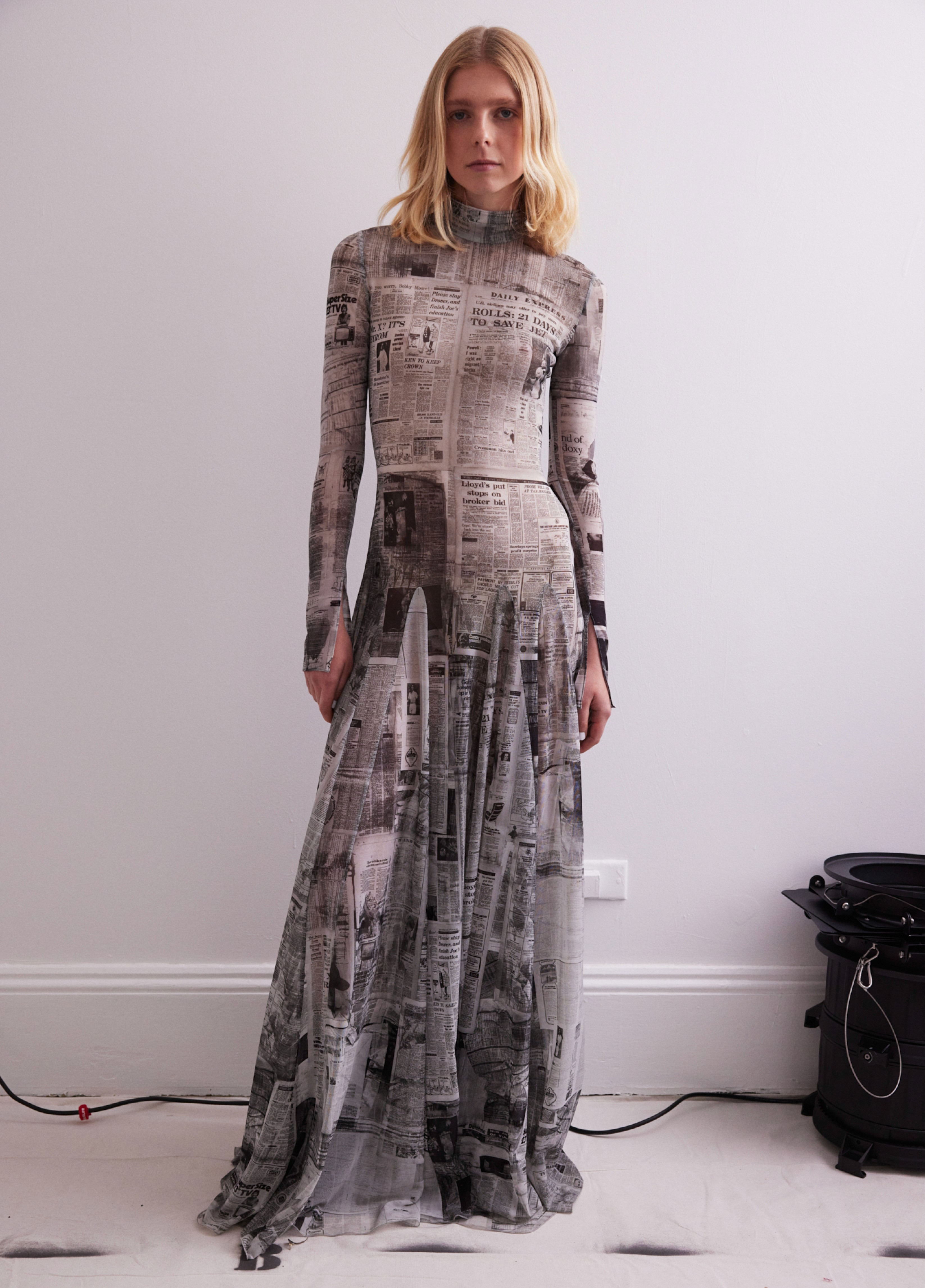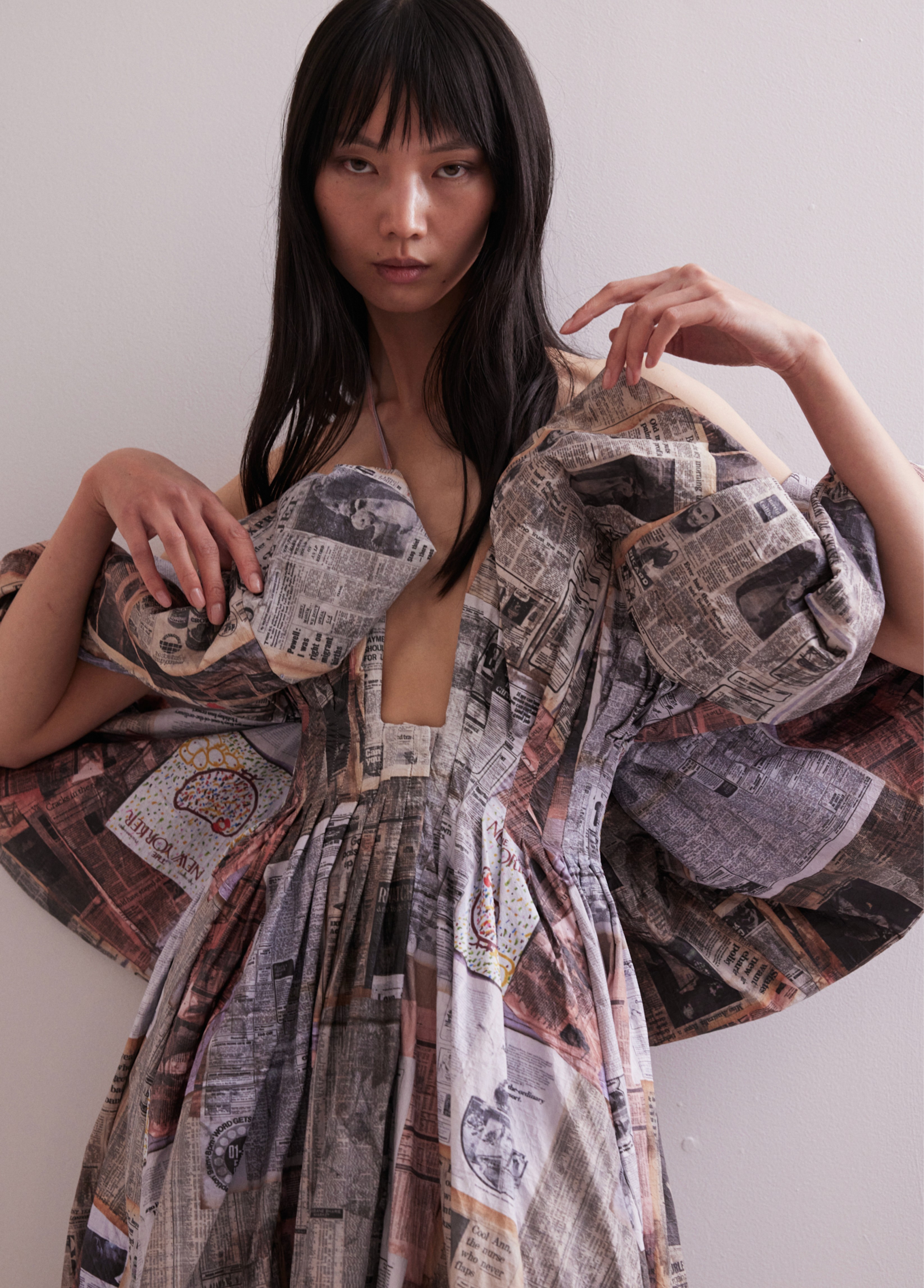 A custom print for the collection was created by collaging vintage international newspapers from 1971. These were plastered, torn, and layered into a word mosaic reflecting the era's trivia and sense of doom. The artwork was then photographed and digitally manipulated for printing on stretch mesh or crinkled, paper-like Tyvek. The handmade artwork was also featured on an upstairs wall during the show.