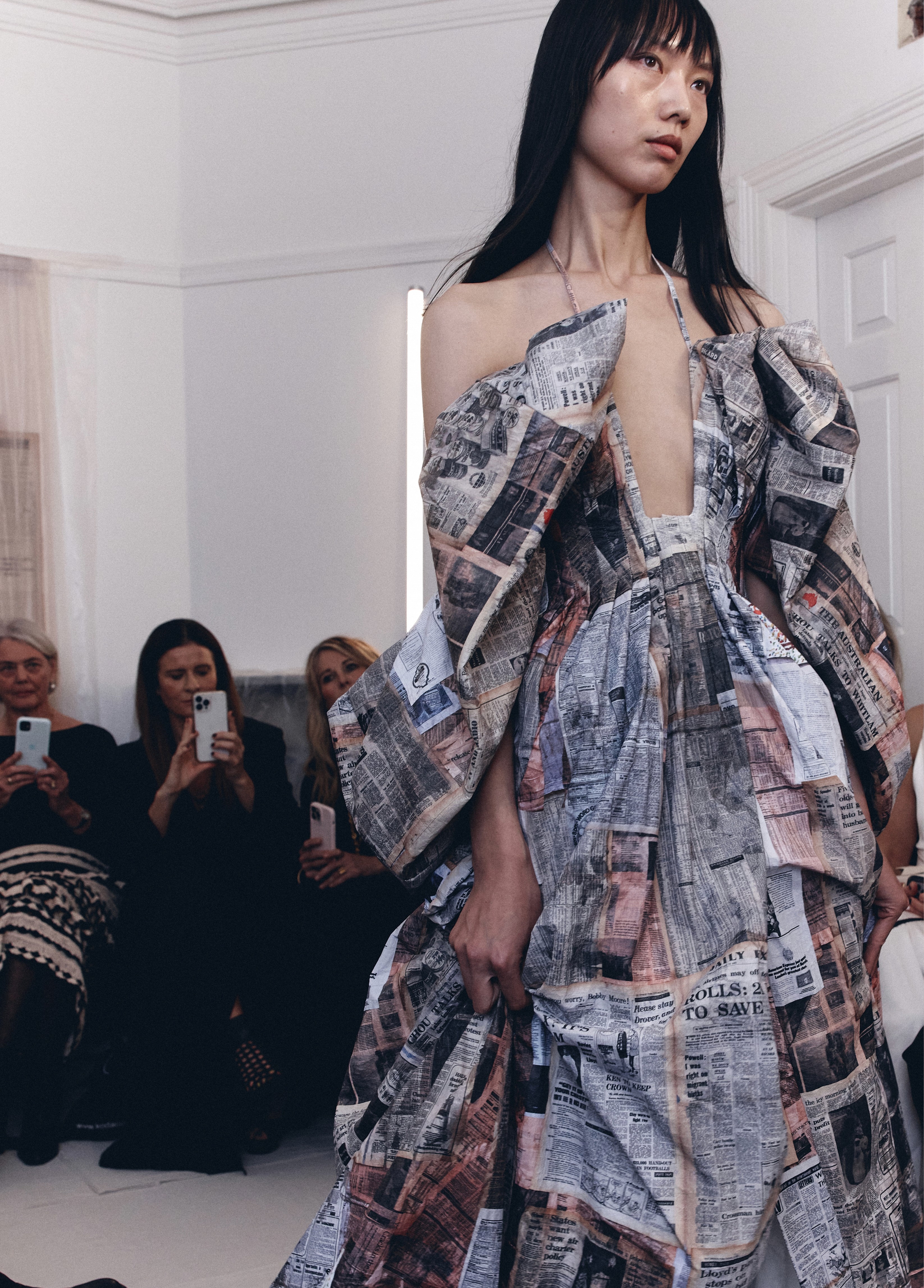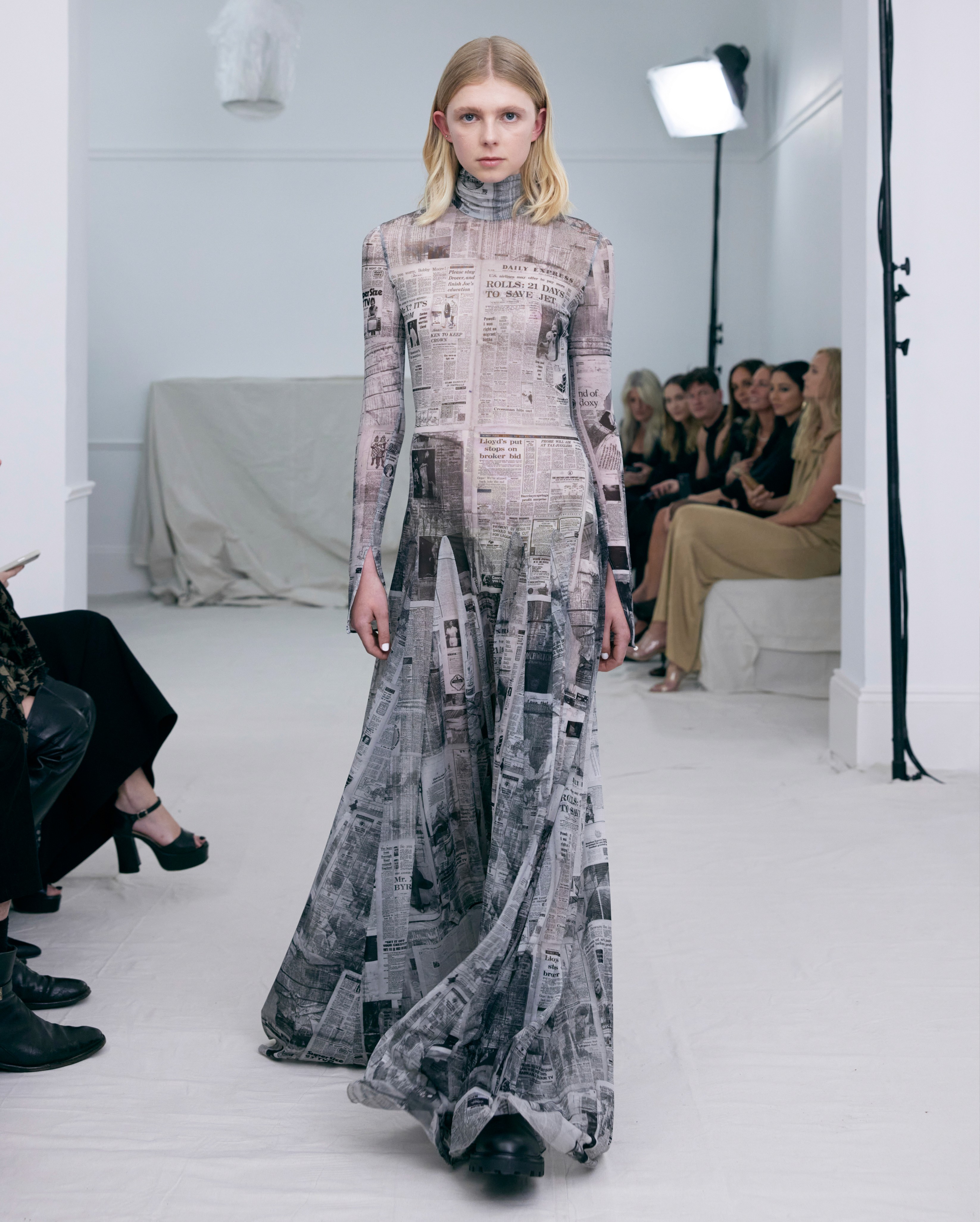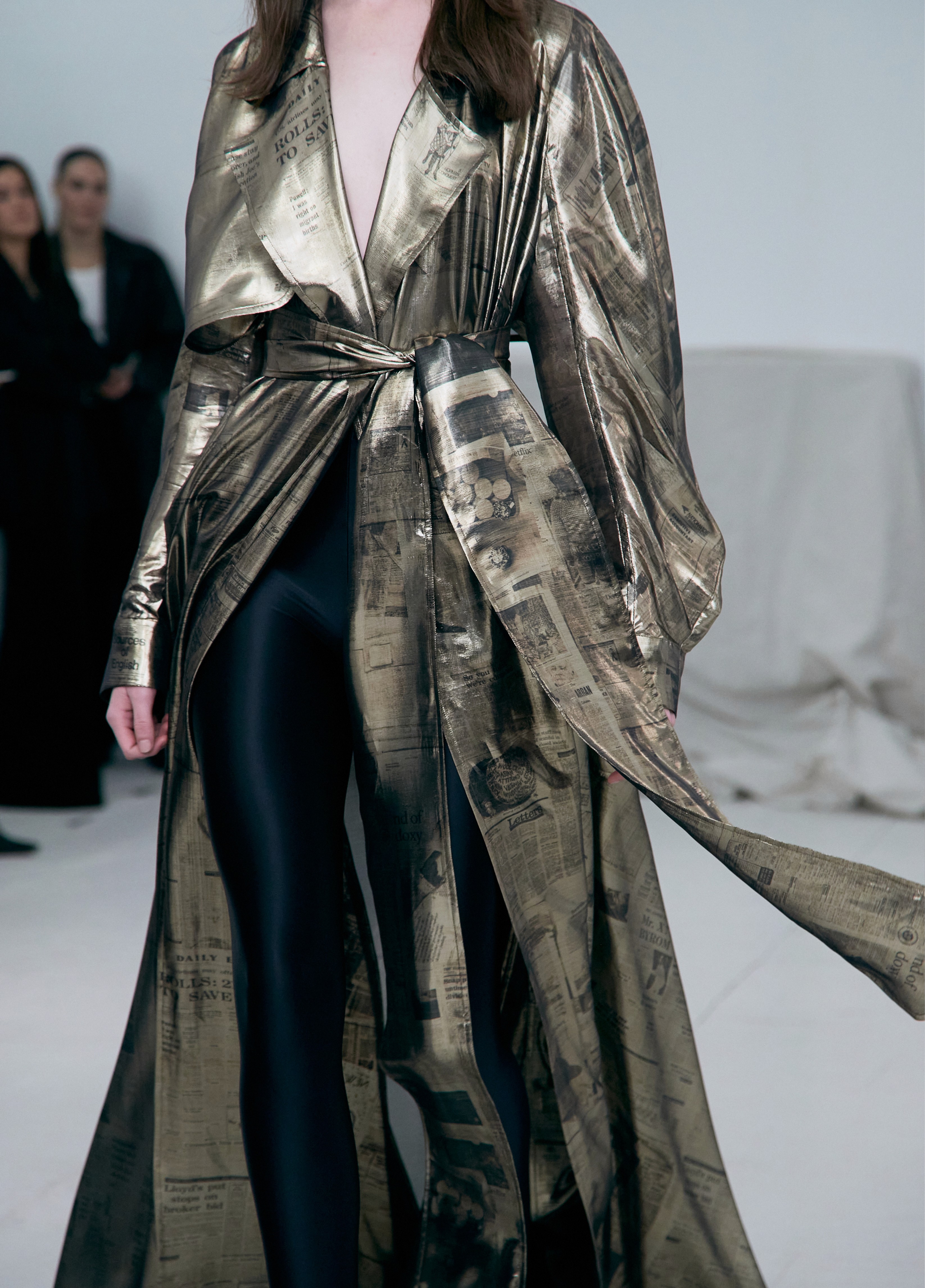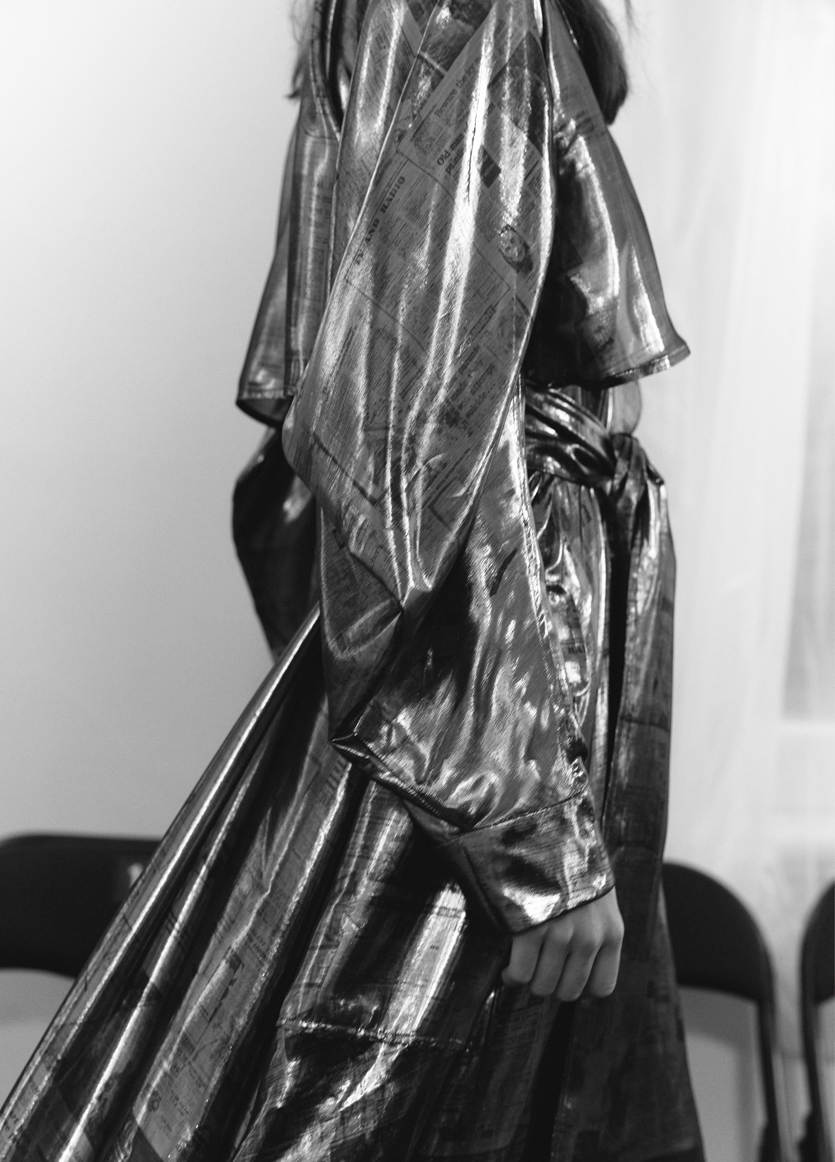 A custom print for the collection was created by collaging vintage international newspapers from 1971. These were plastered, torn, and layered into a word mosaic reflecting the era's trivia and sense of doom. The artwork was then photographed and digitally manipulated for printing on stretch mesh or crinkled, paper-like Tyvek. The handmade artwork was also featured on an upstairs wall during the show.
