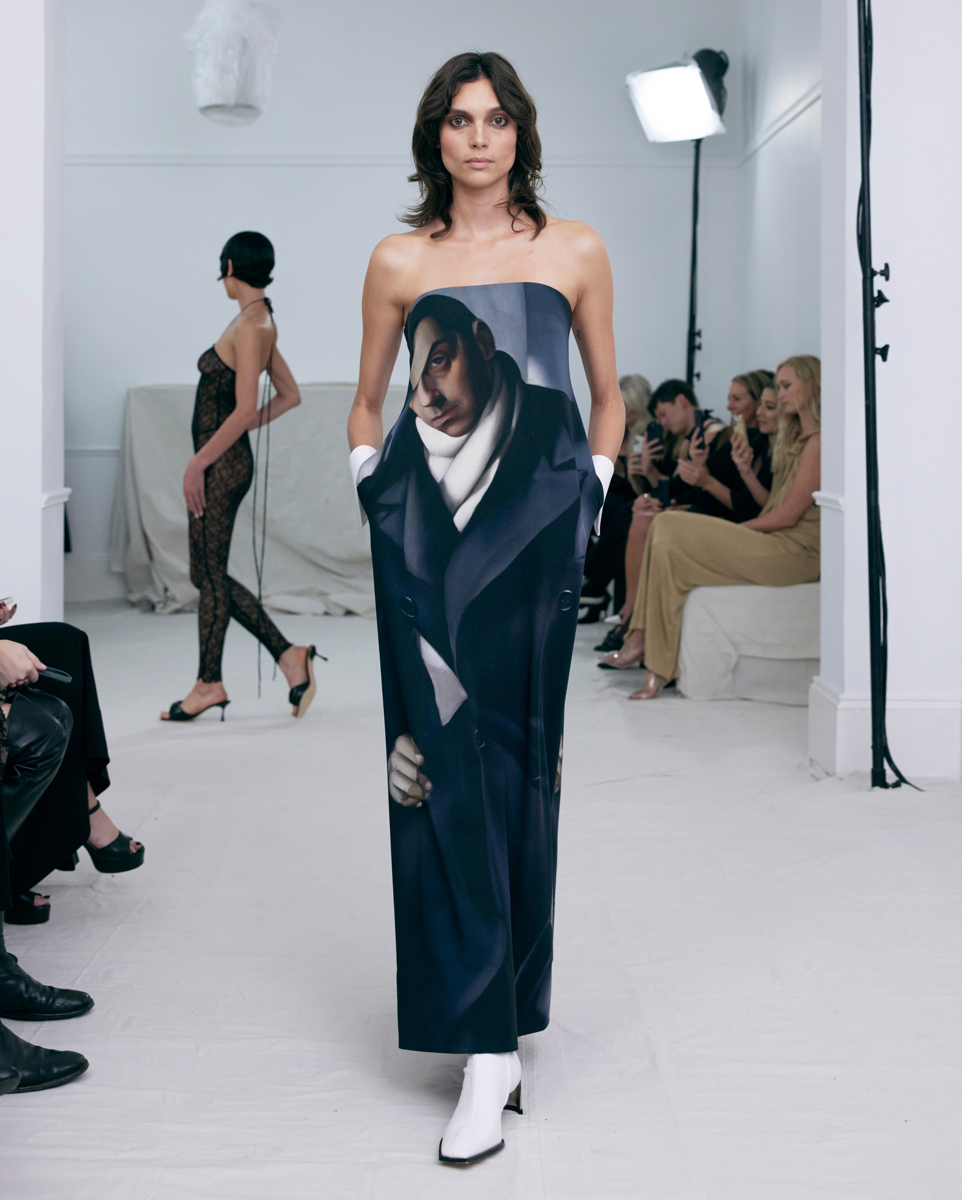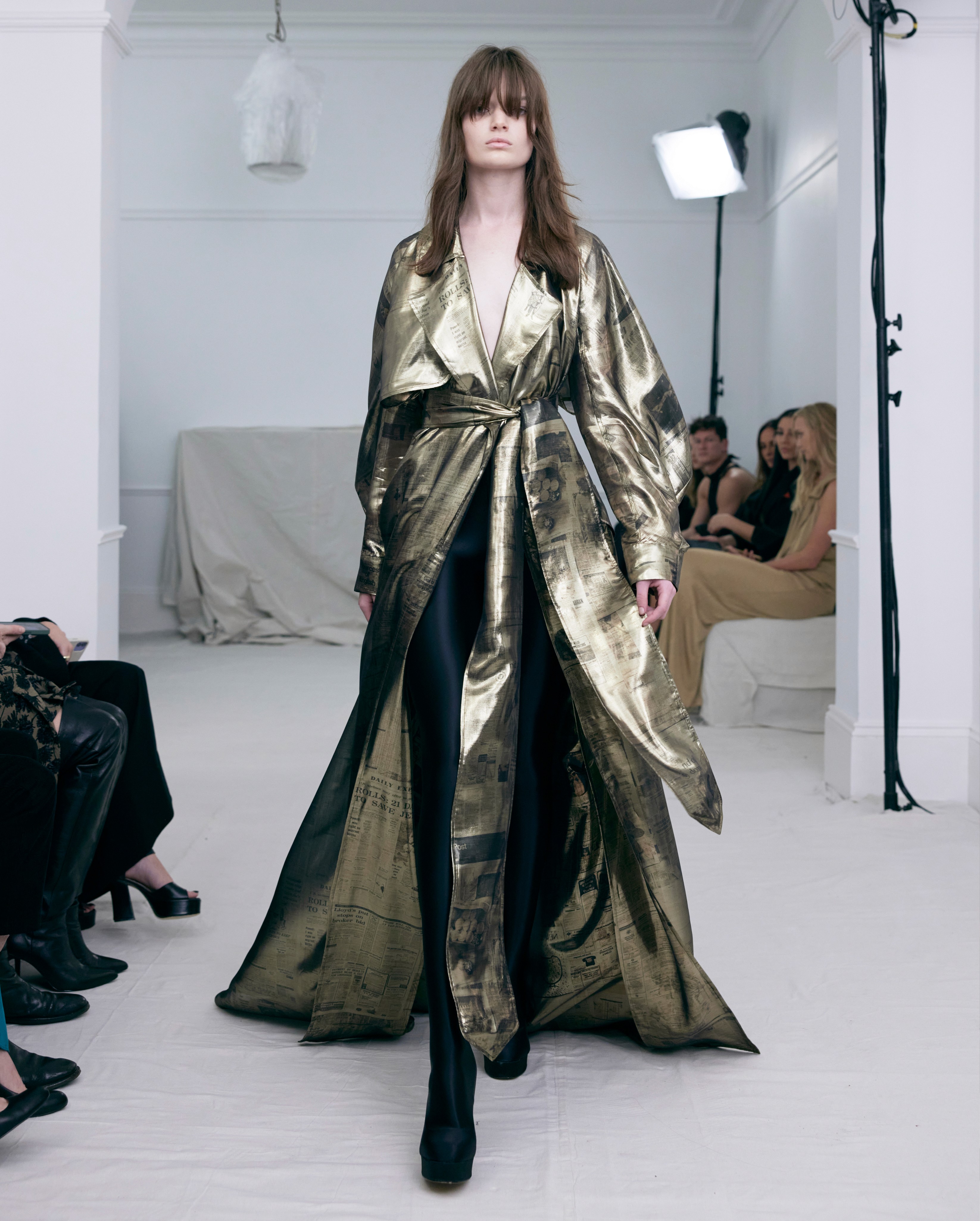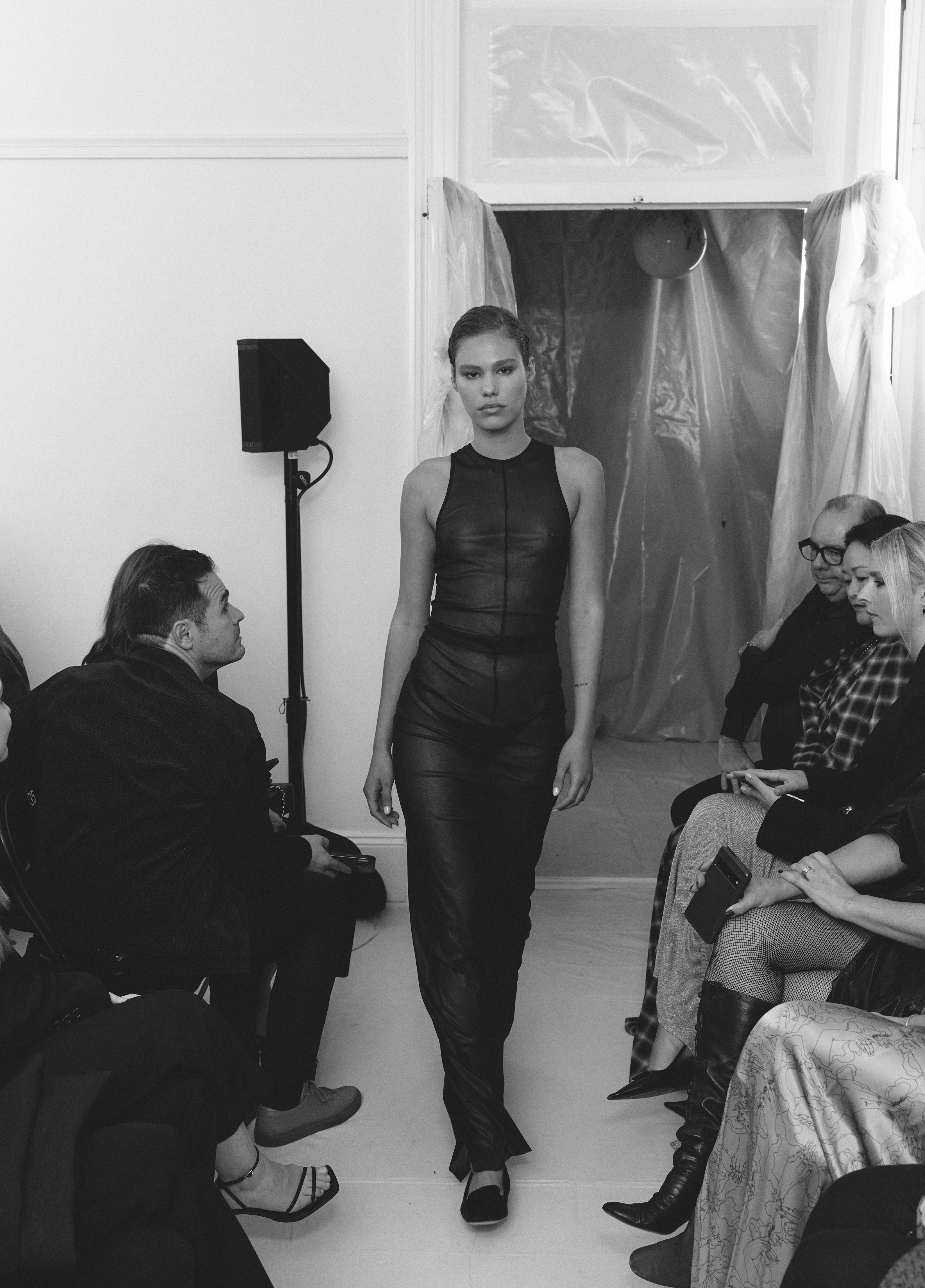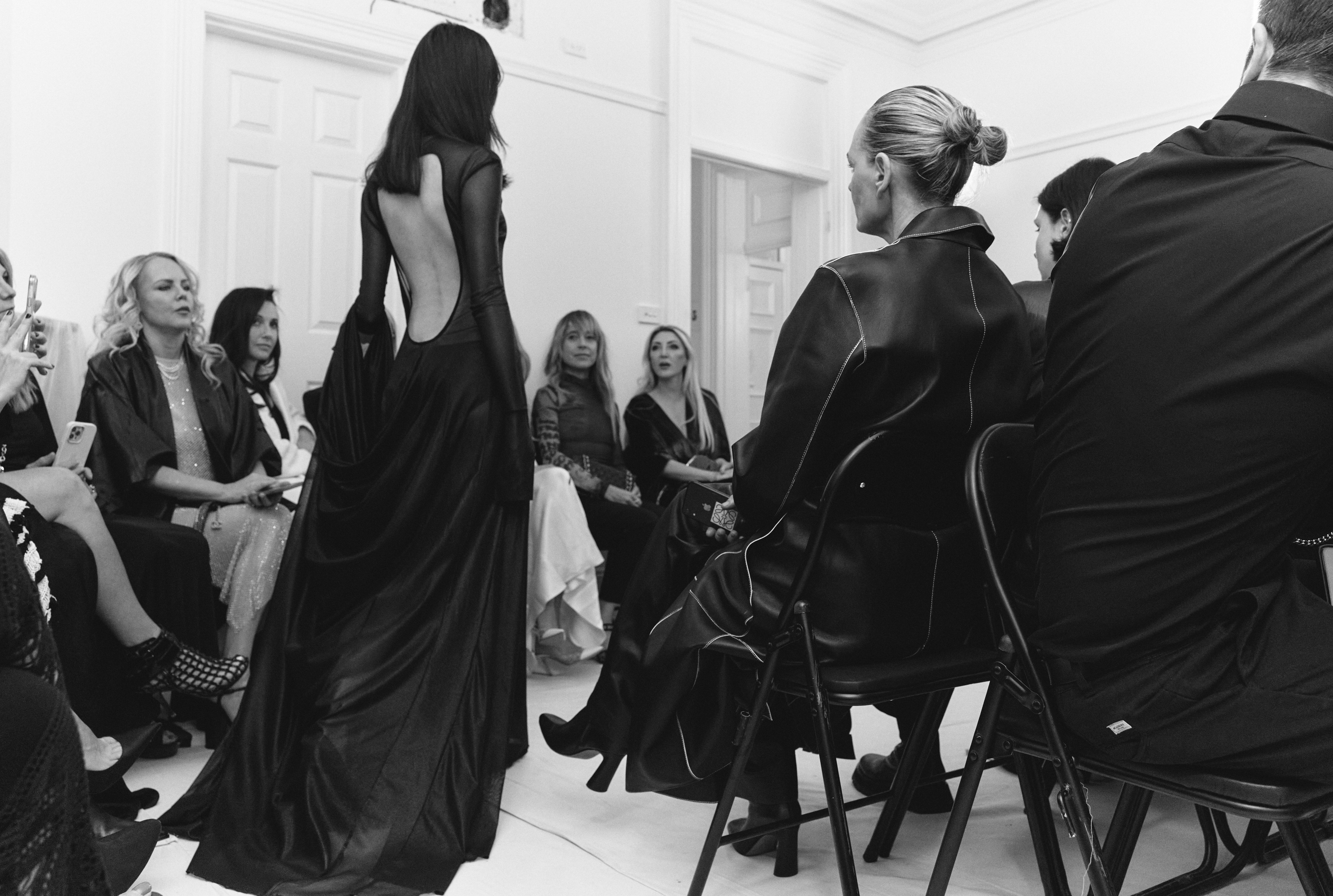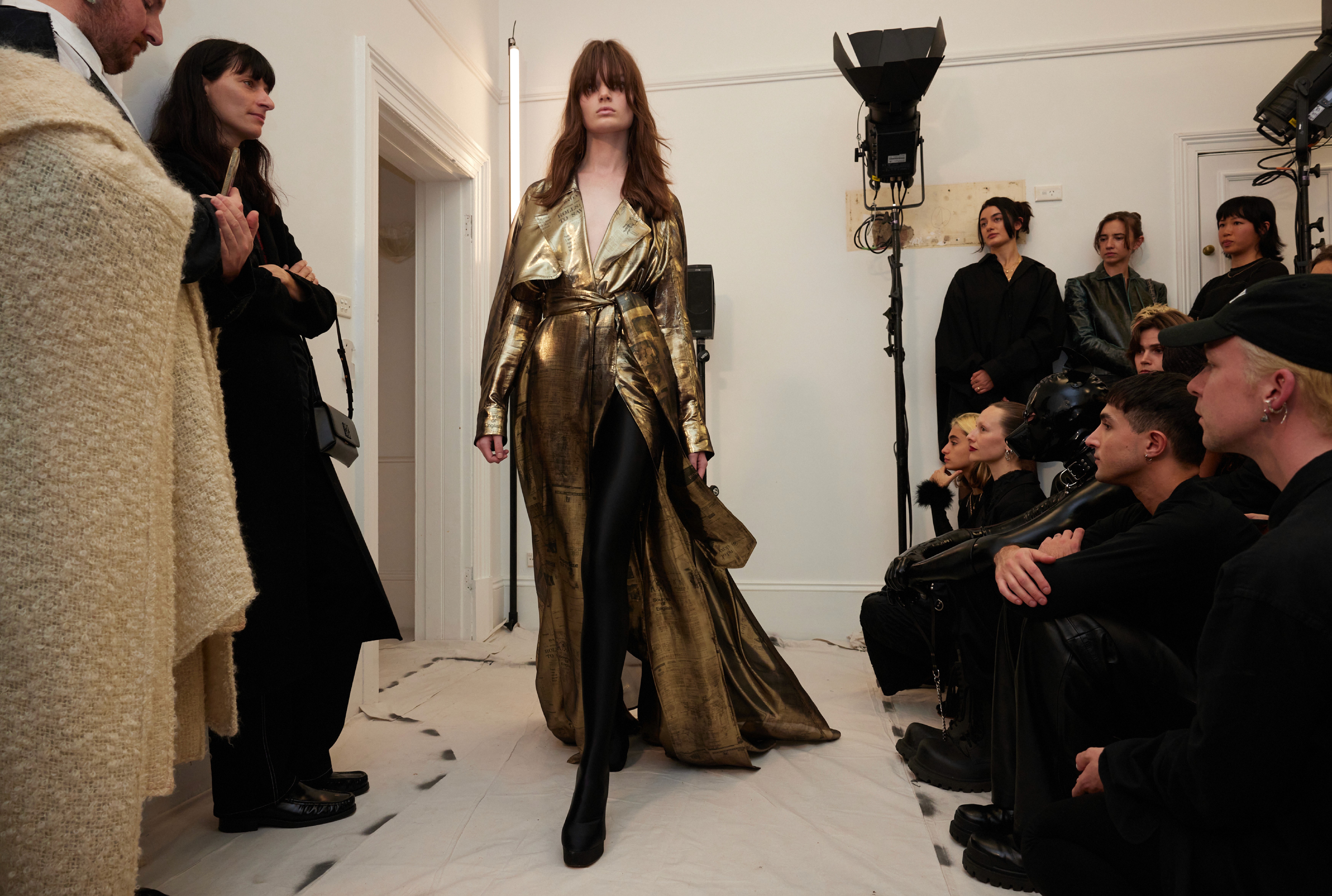 The show direction, in partnership with RIZER Global, wrapped 8 Challis Avenue in a blank canvas, providing a bold contrast to Alleycat's debauchery and suggesting a space perpetually under construction and evolution. Models moved through many rooms, some tightly packed, others with seating, channelling turn-of-the-century couture salons and punk fashion parties from the late '80s and early '90s. Clean, diffuse lighting made details and fabrics easy to see and photograph.