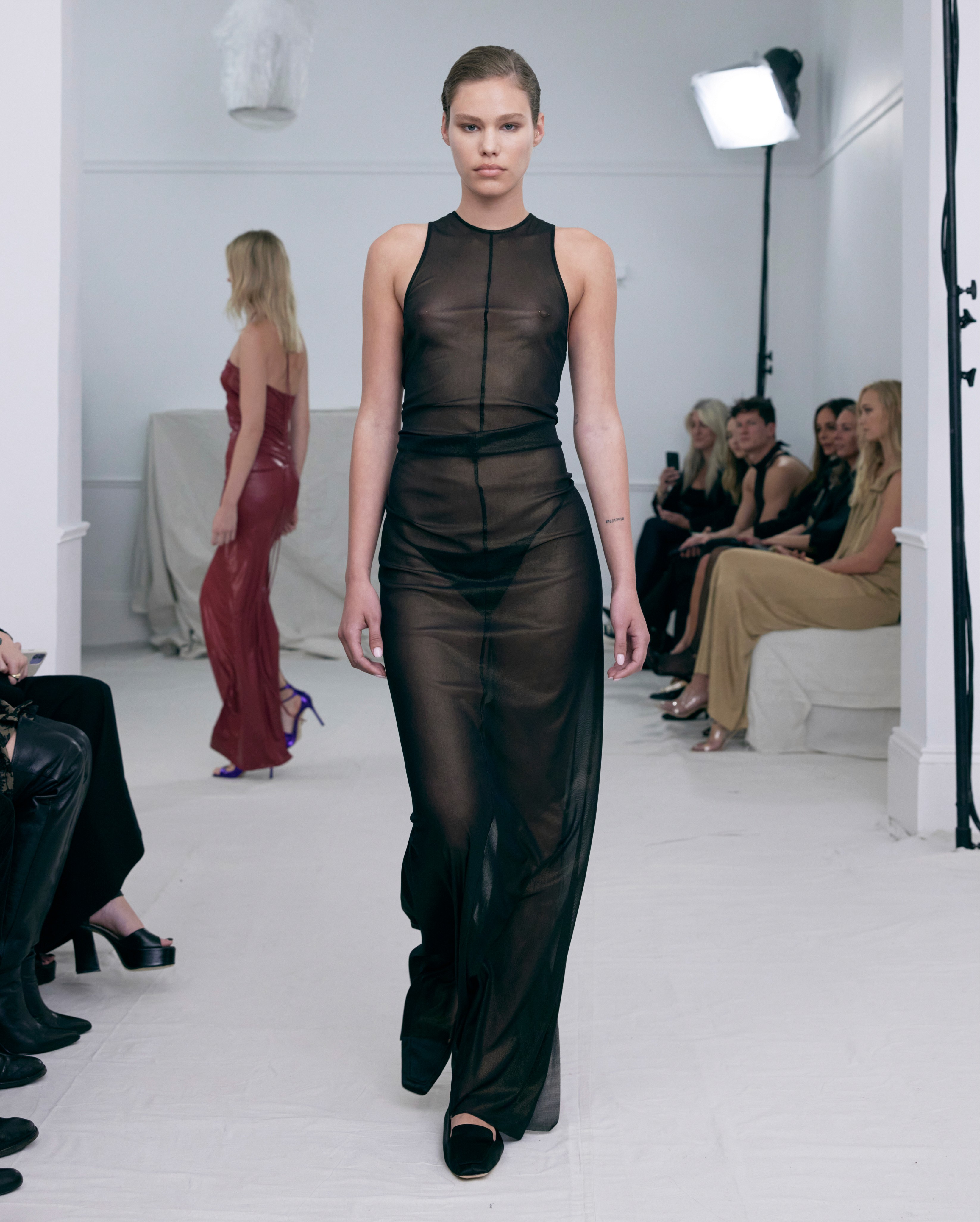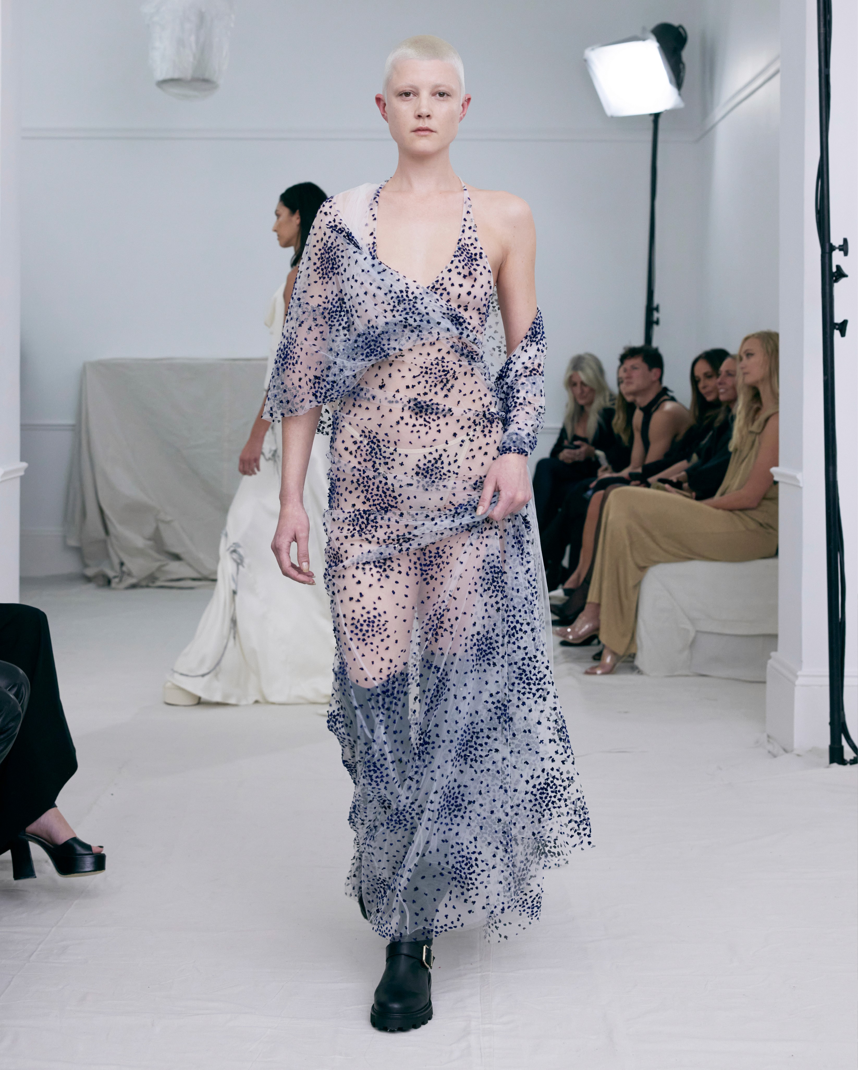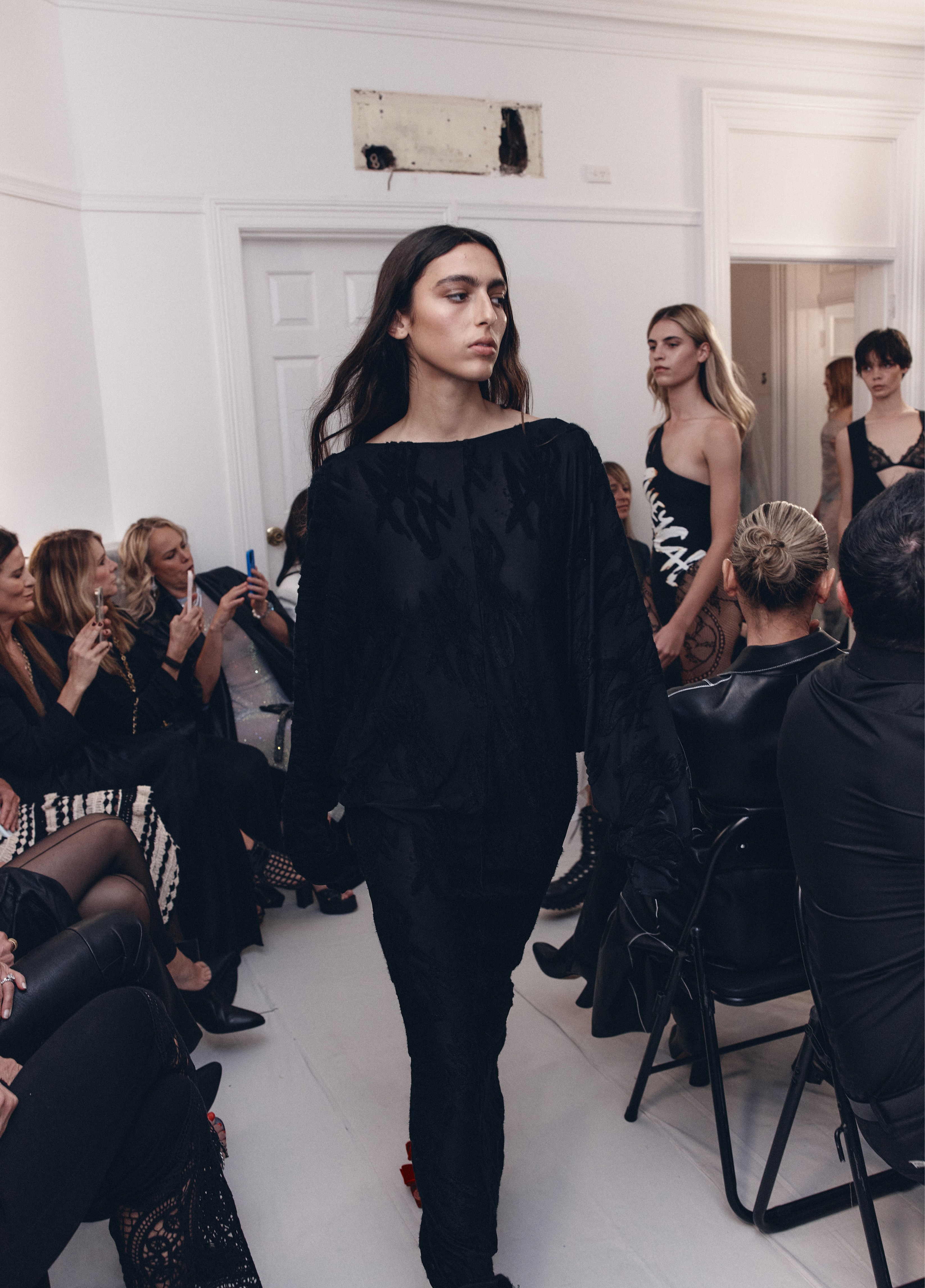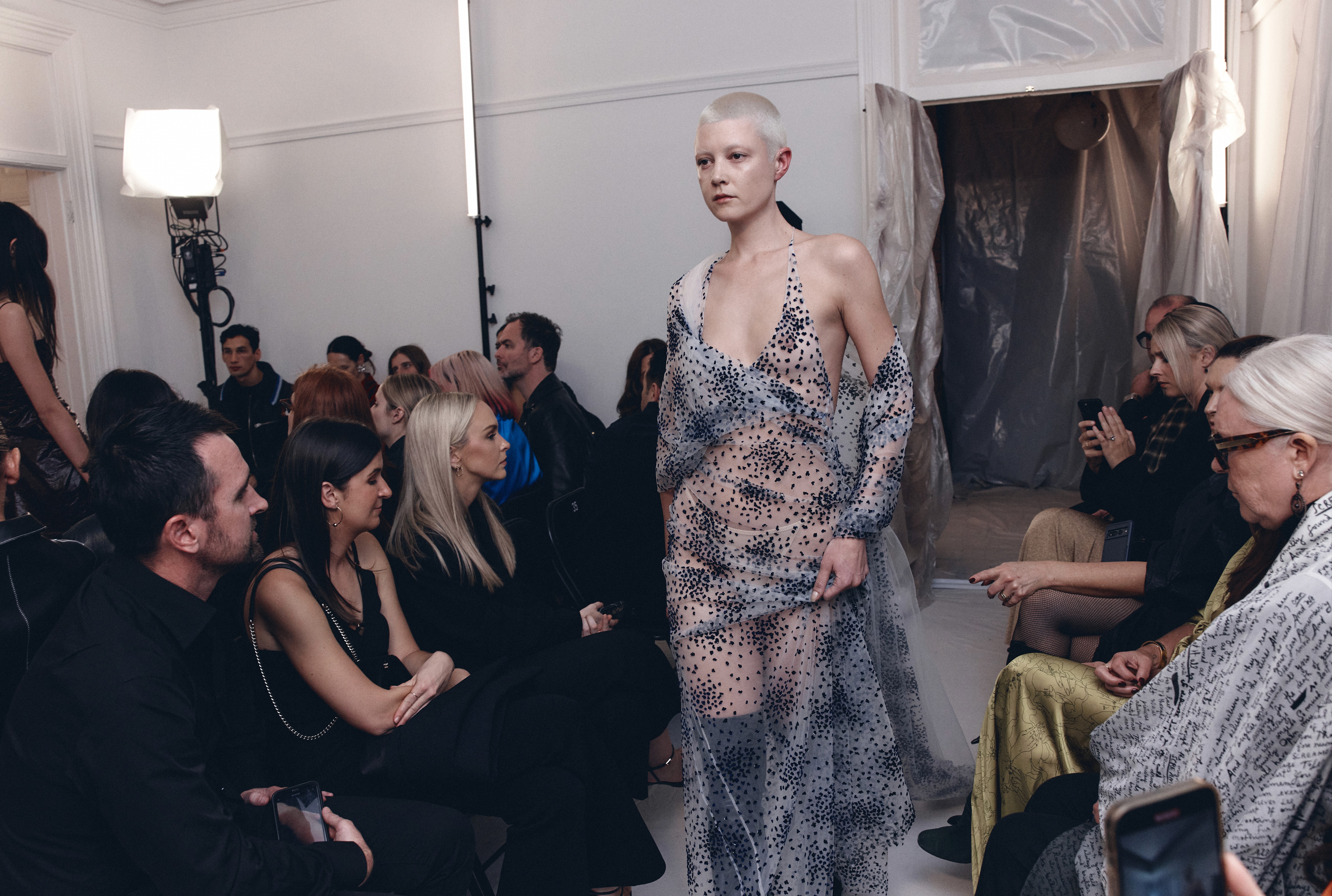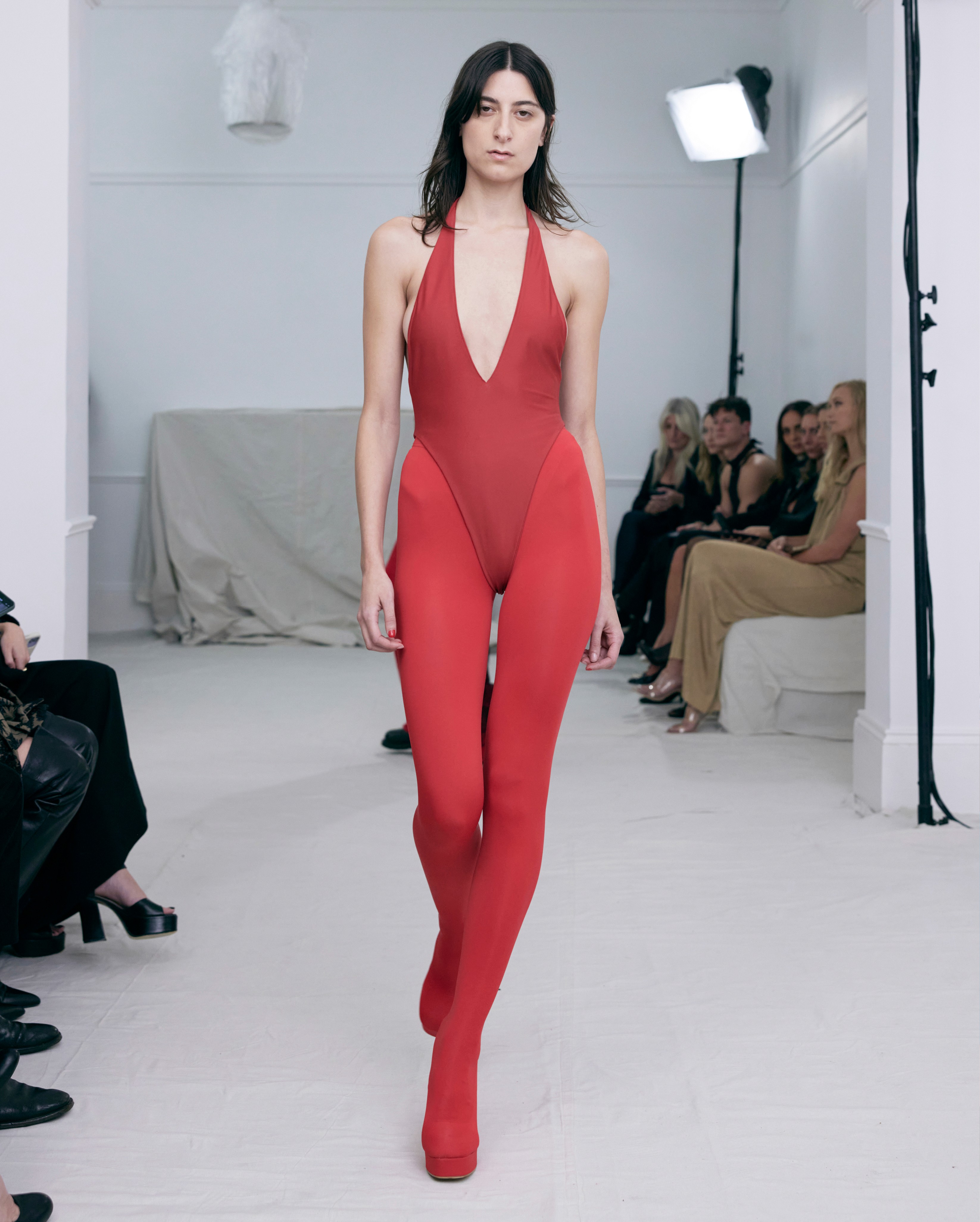 The show direction, in partnership with RIZER Global, wrapped 8 Challis Avenue in a blank canvas, providing a bold contrast to Alleycat's debauchery and suggesting a space perpetually under construction and evolution. Models moved through many rooms, some tightly packed, others with seating, channelling turn-of-the-century couture salons and punk fashion parties from the late '80s and early '90s. Clean, diffuse lighting made details and fabrics easy to see and photograph.