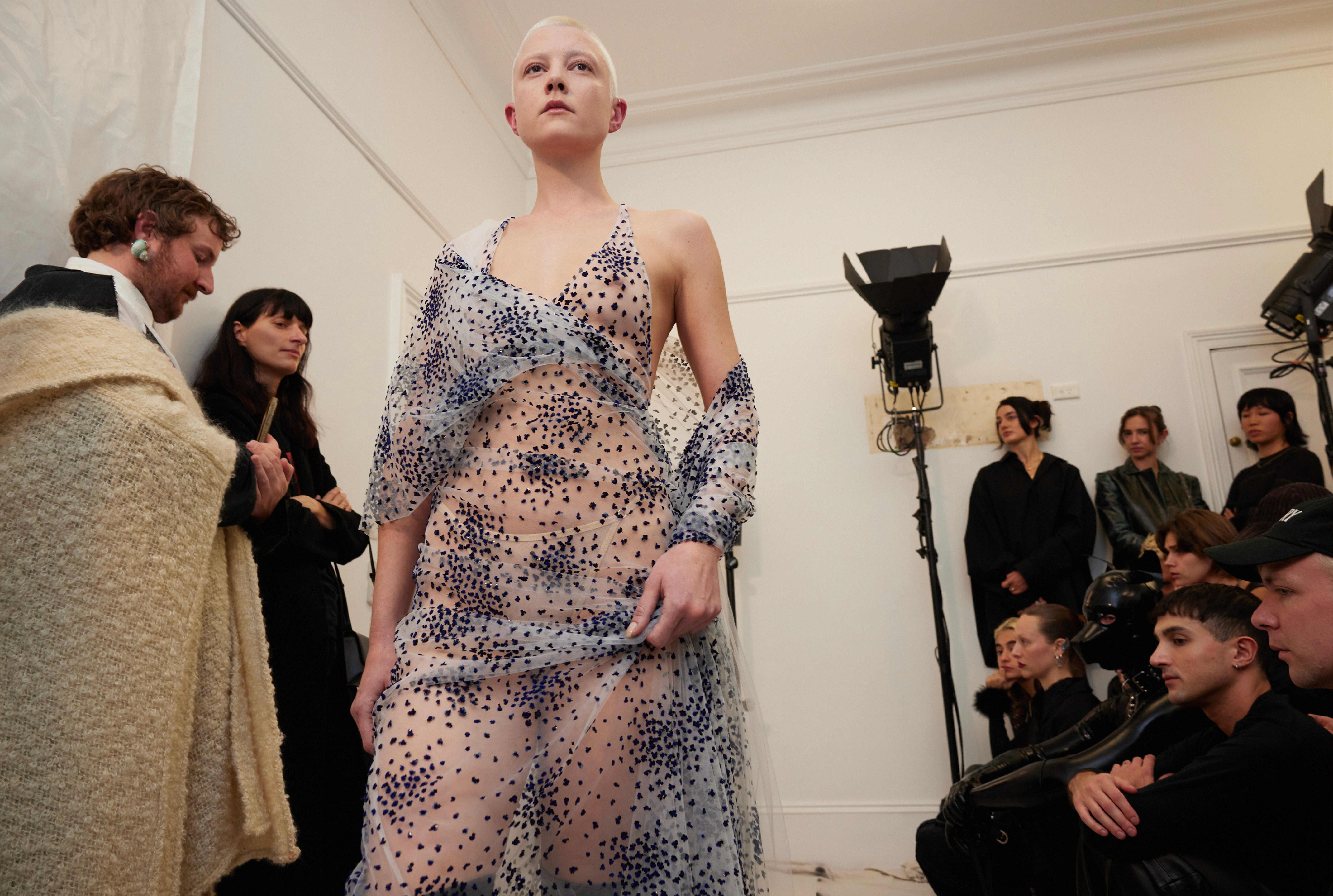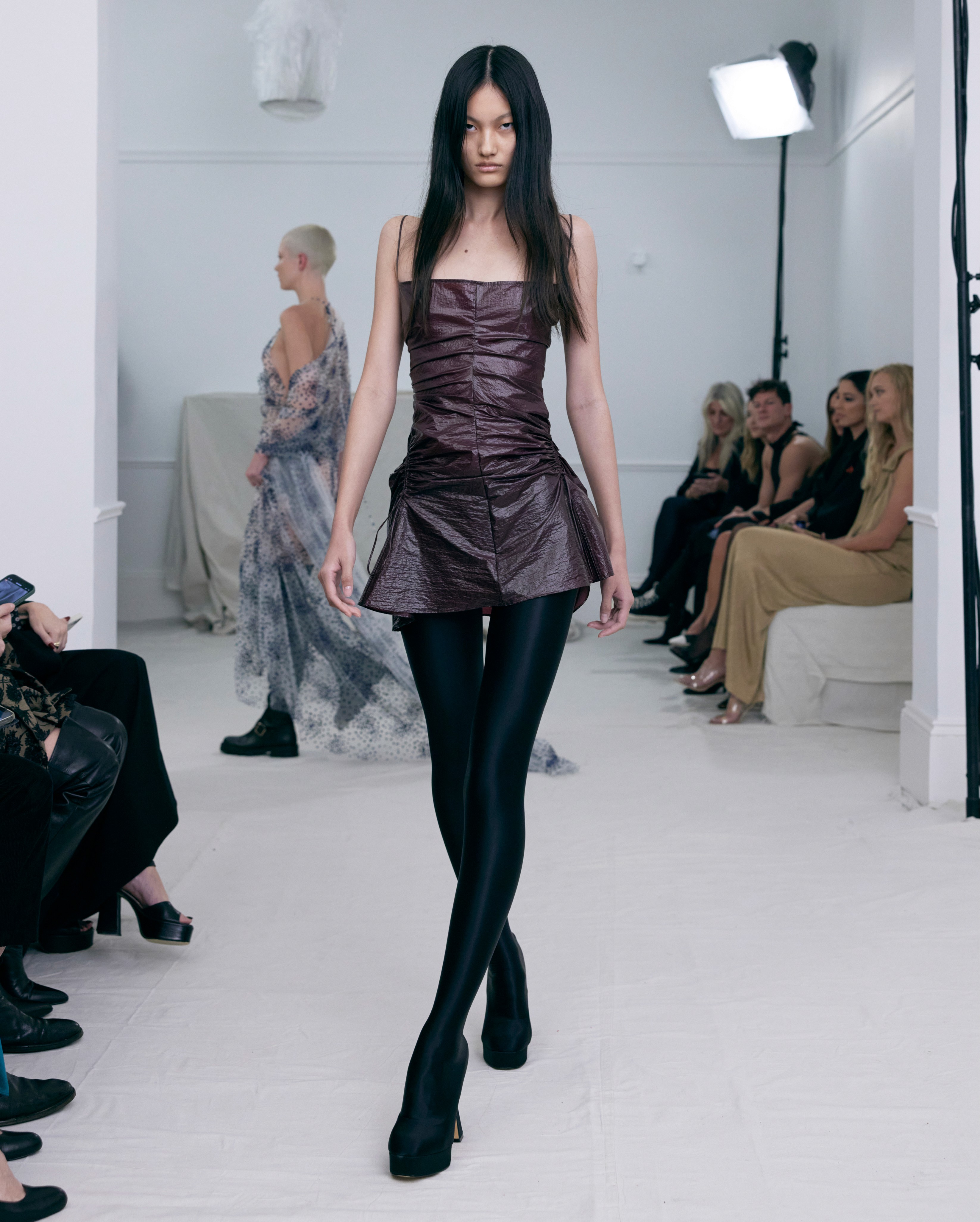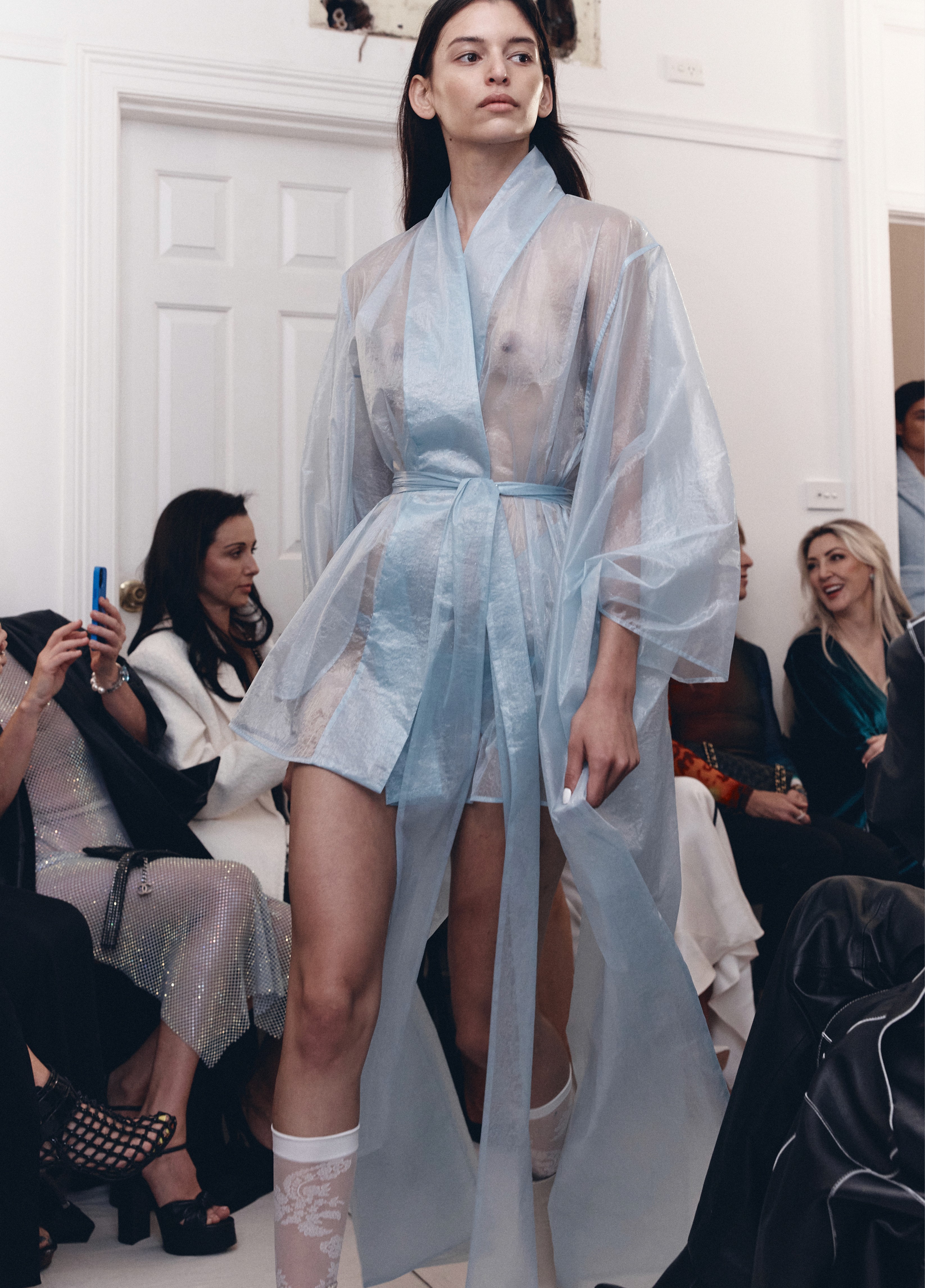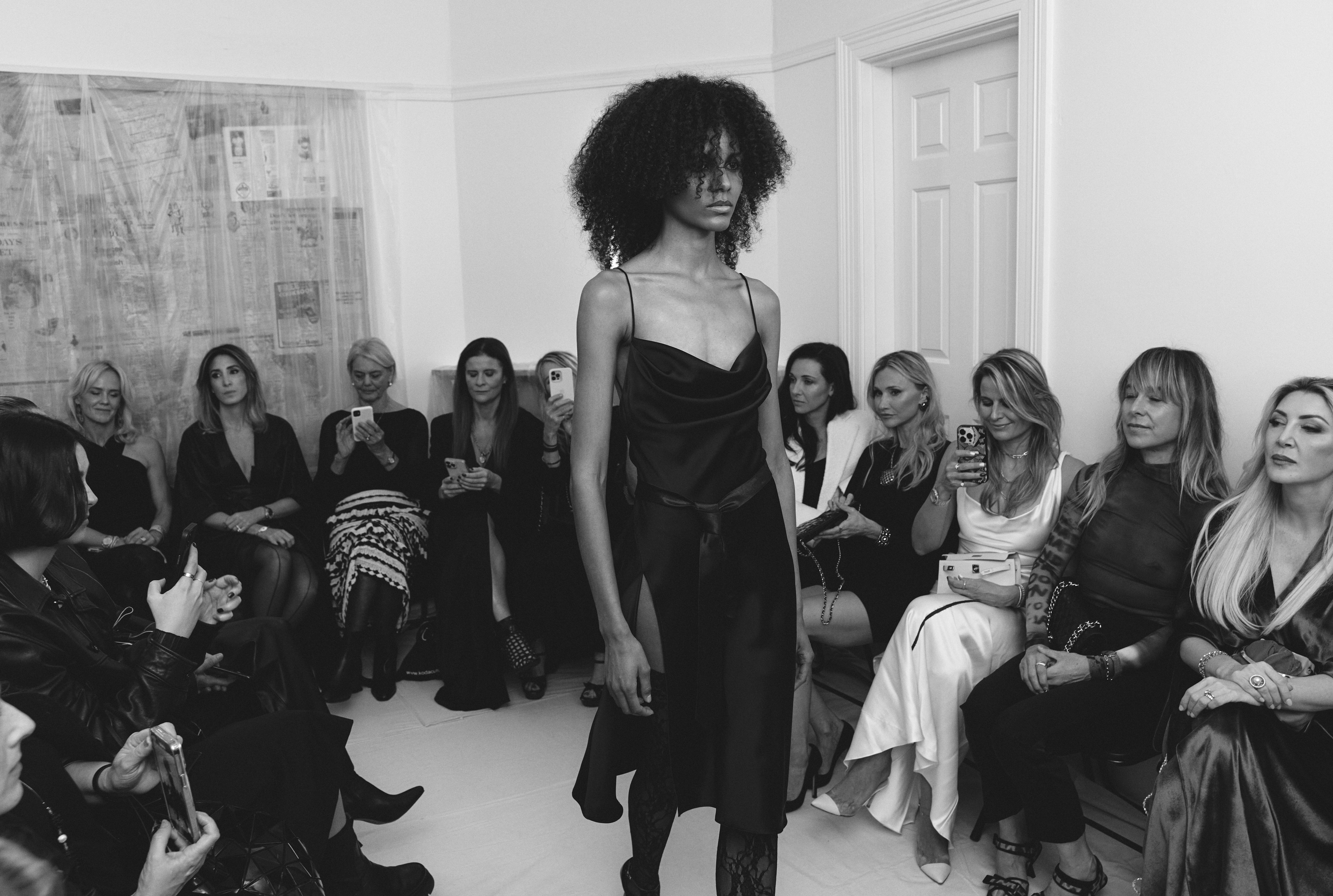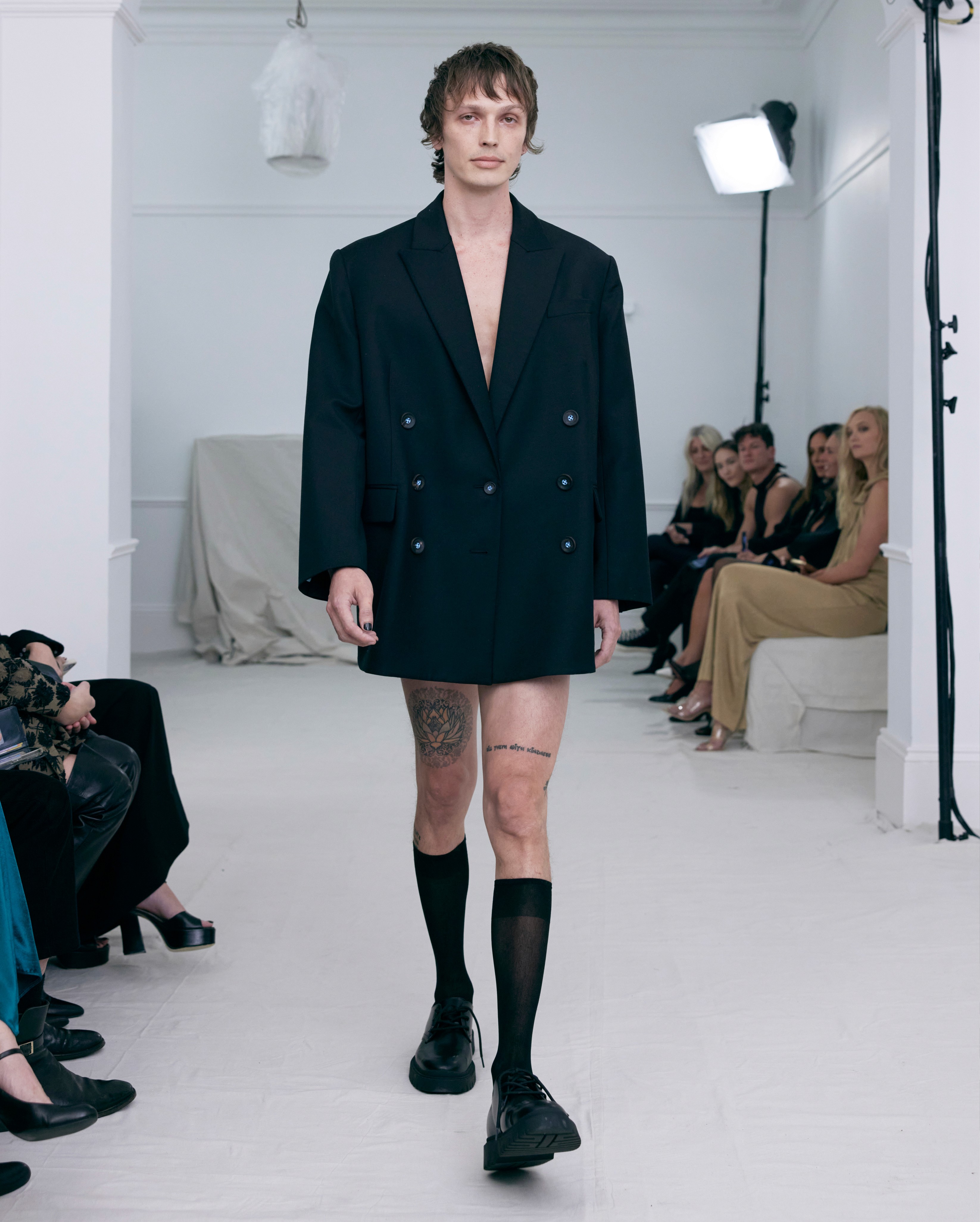 The show direction, in partnership with RIZER Global, wrapped 8 Challis Avenue in a blank canvas, providing a bold contrast to Alleycat's debauchery and suggesting a space perpetually under construction and evolution. Models moved through many rooms, some tightly packed, others with seating, channelling turn-of-the-century couture salons and punk fashion parties from the late '80s and early '90s. Clean, diffuse lighting made details and fabrics easy to see and photograph.
