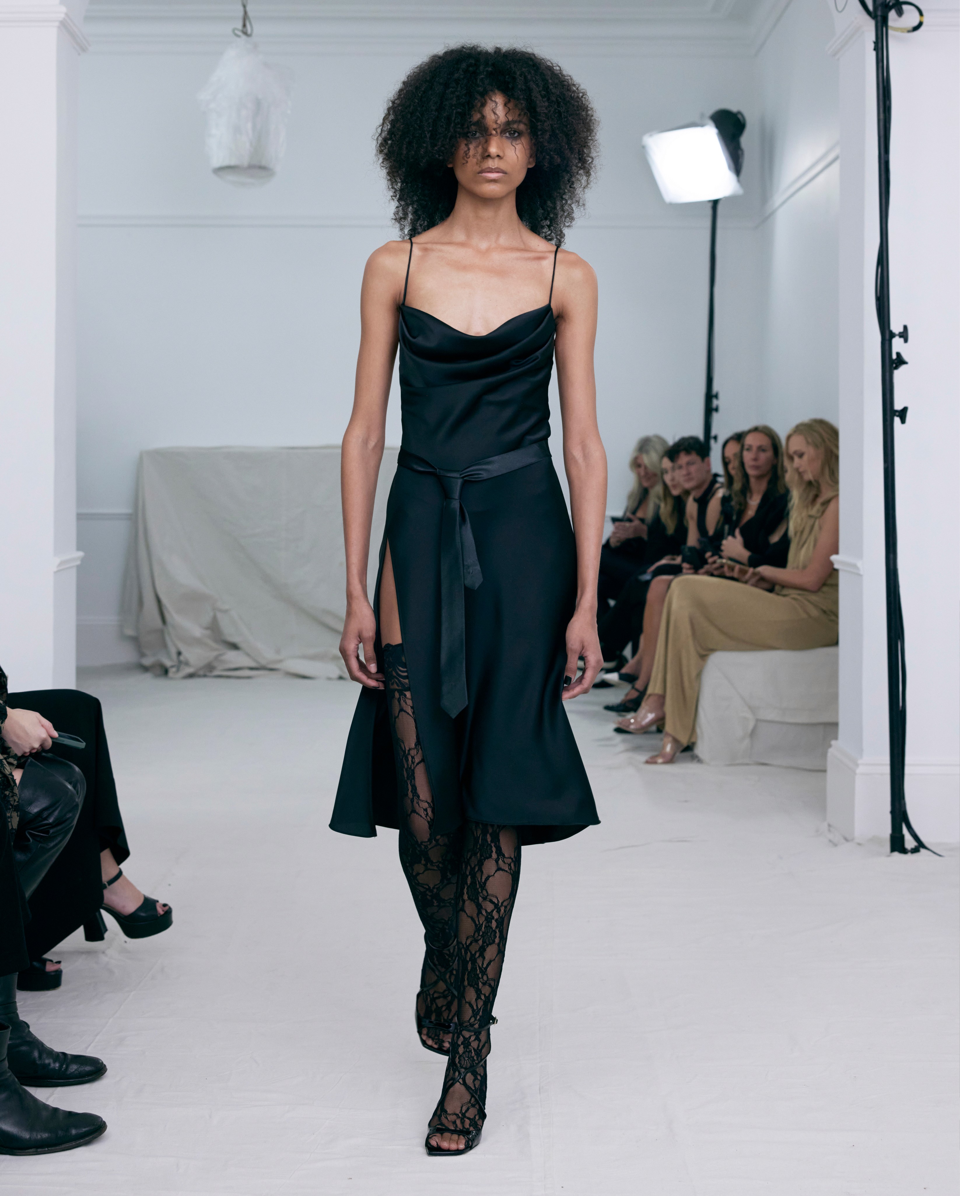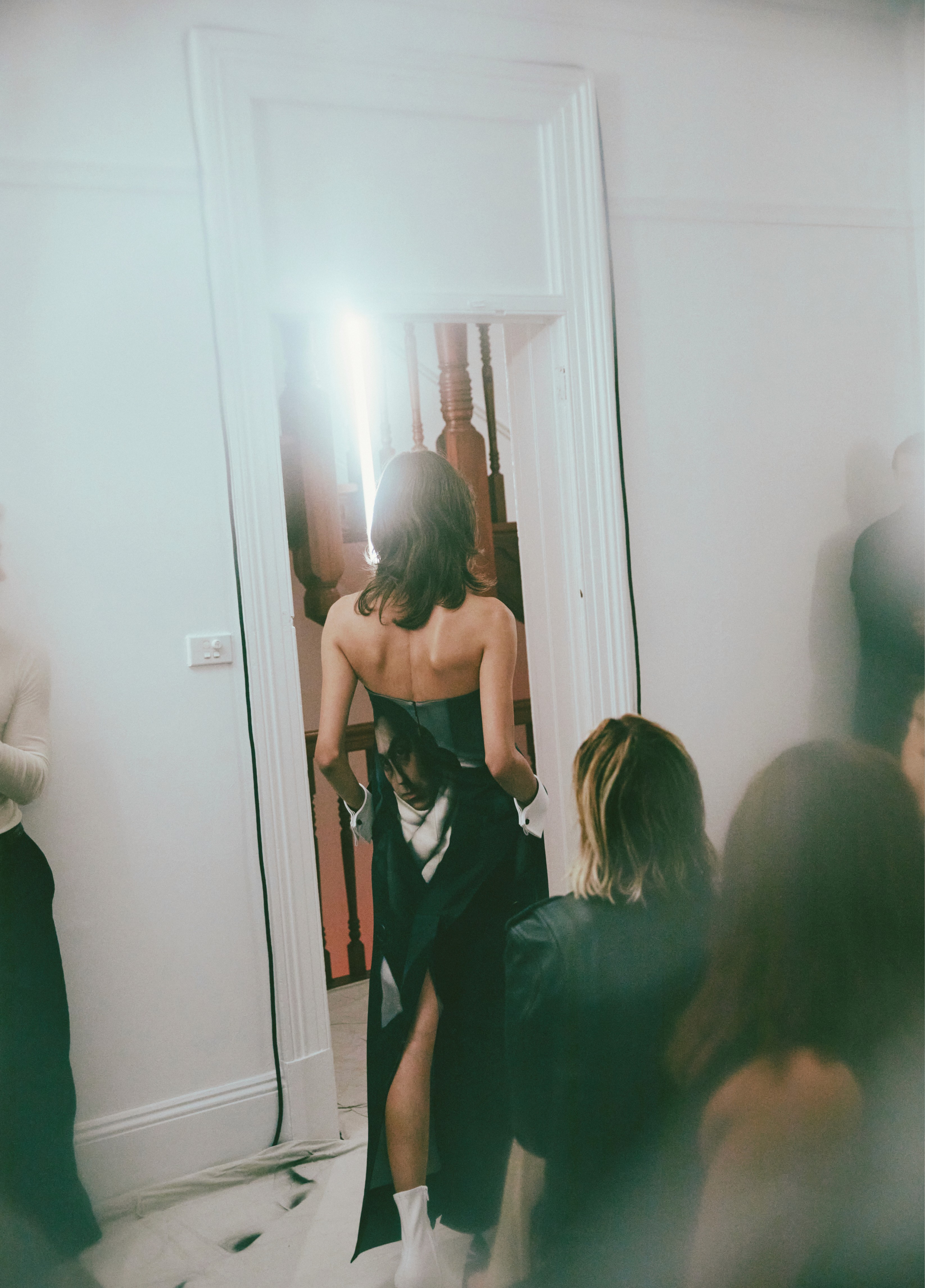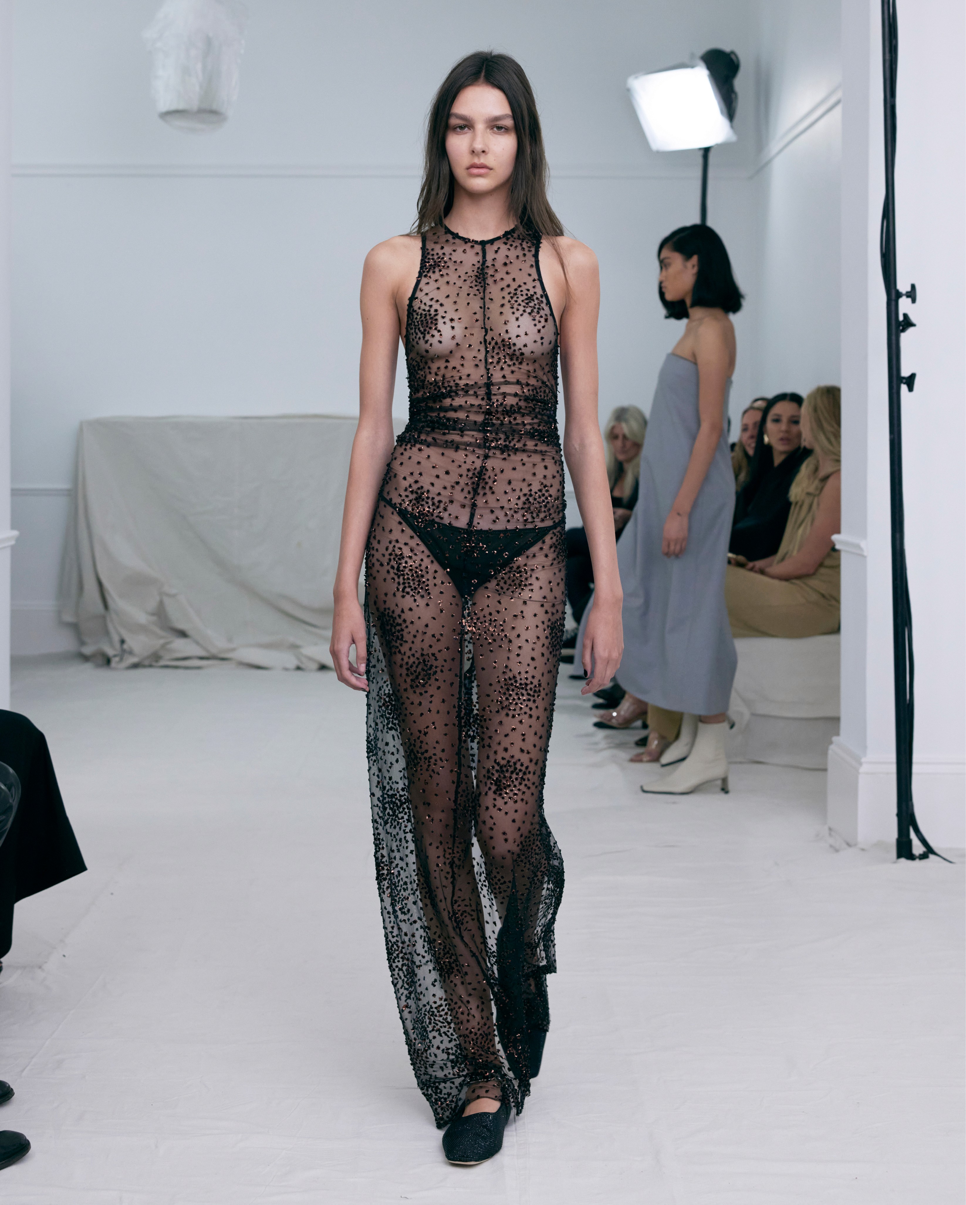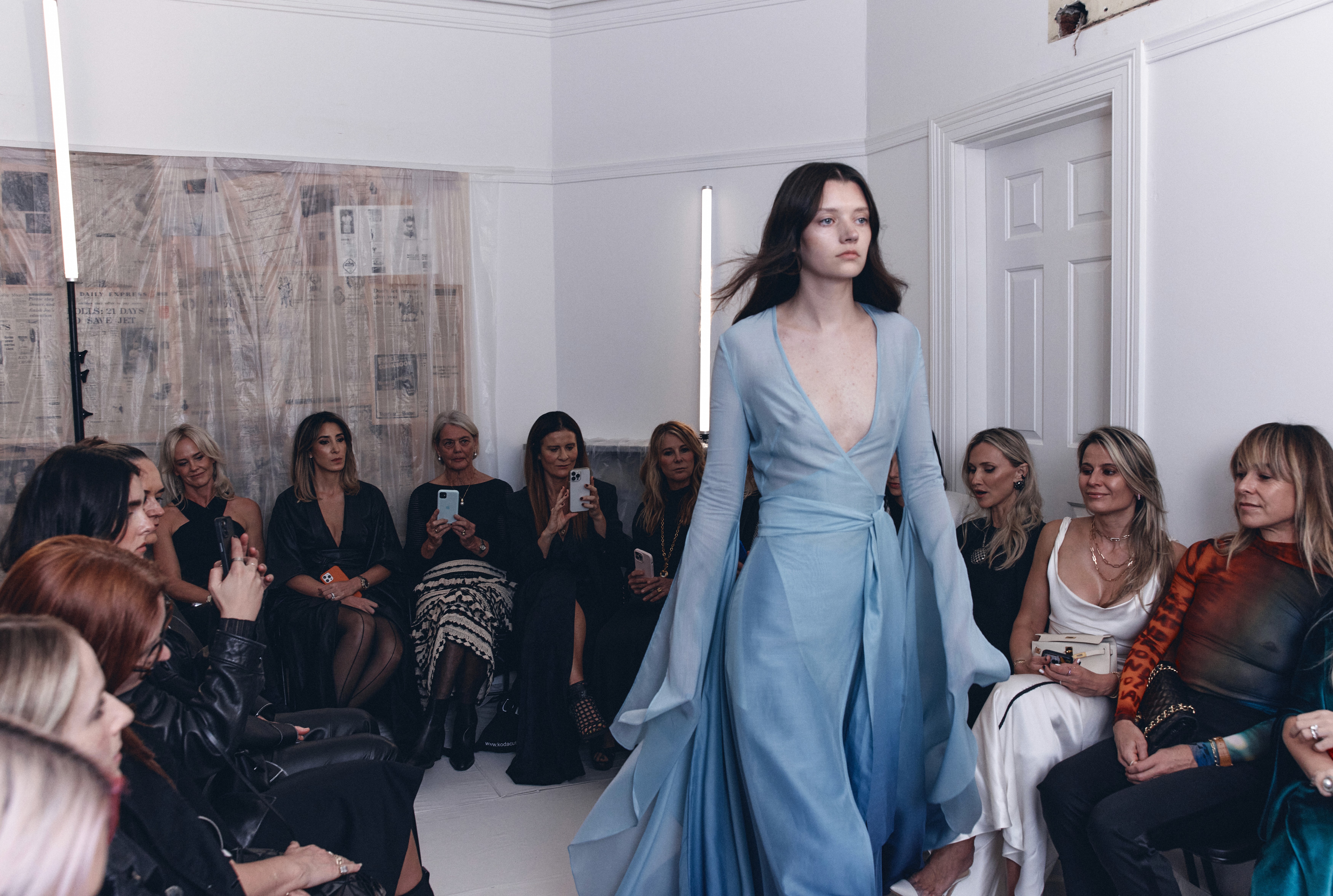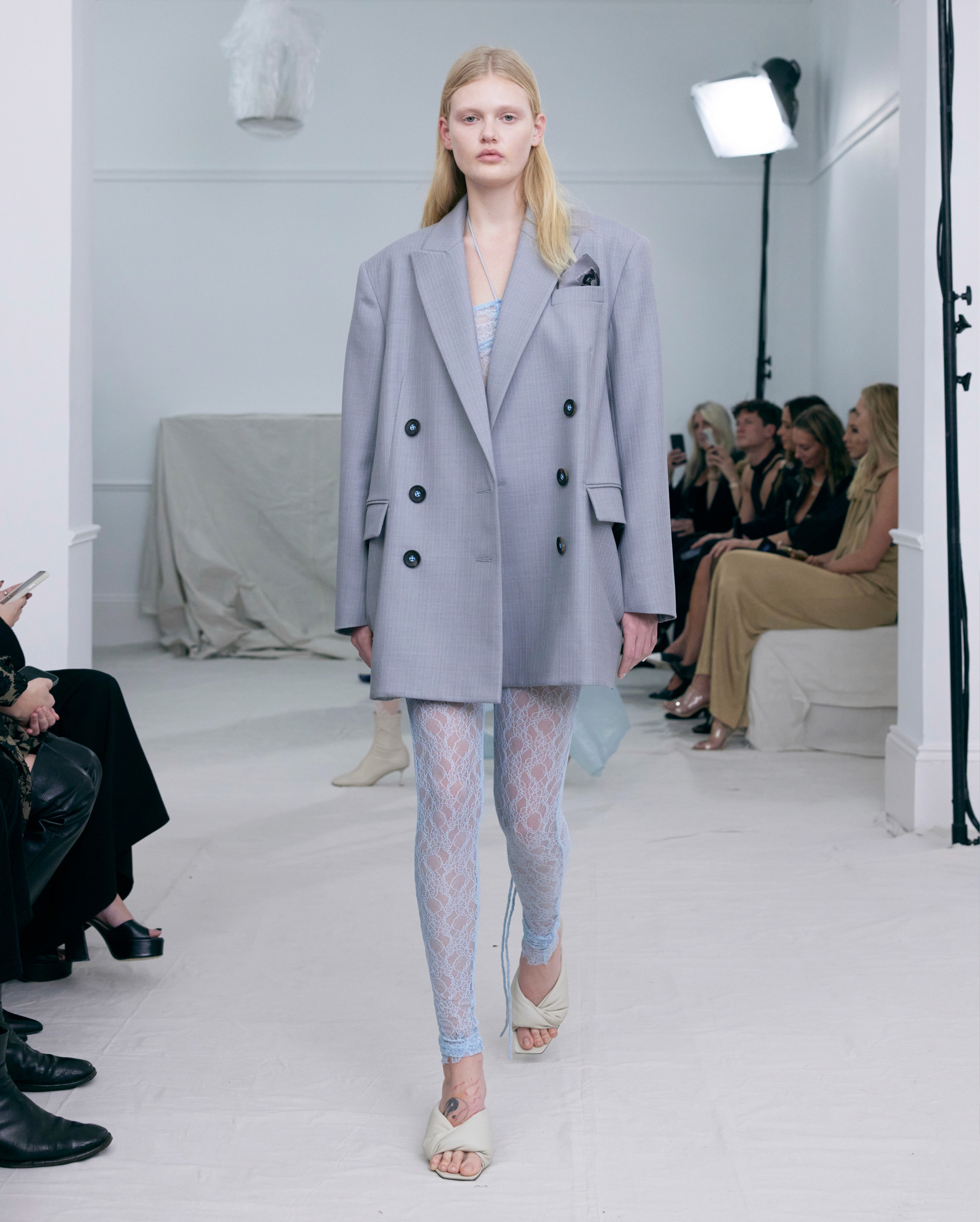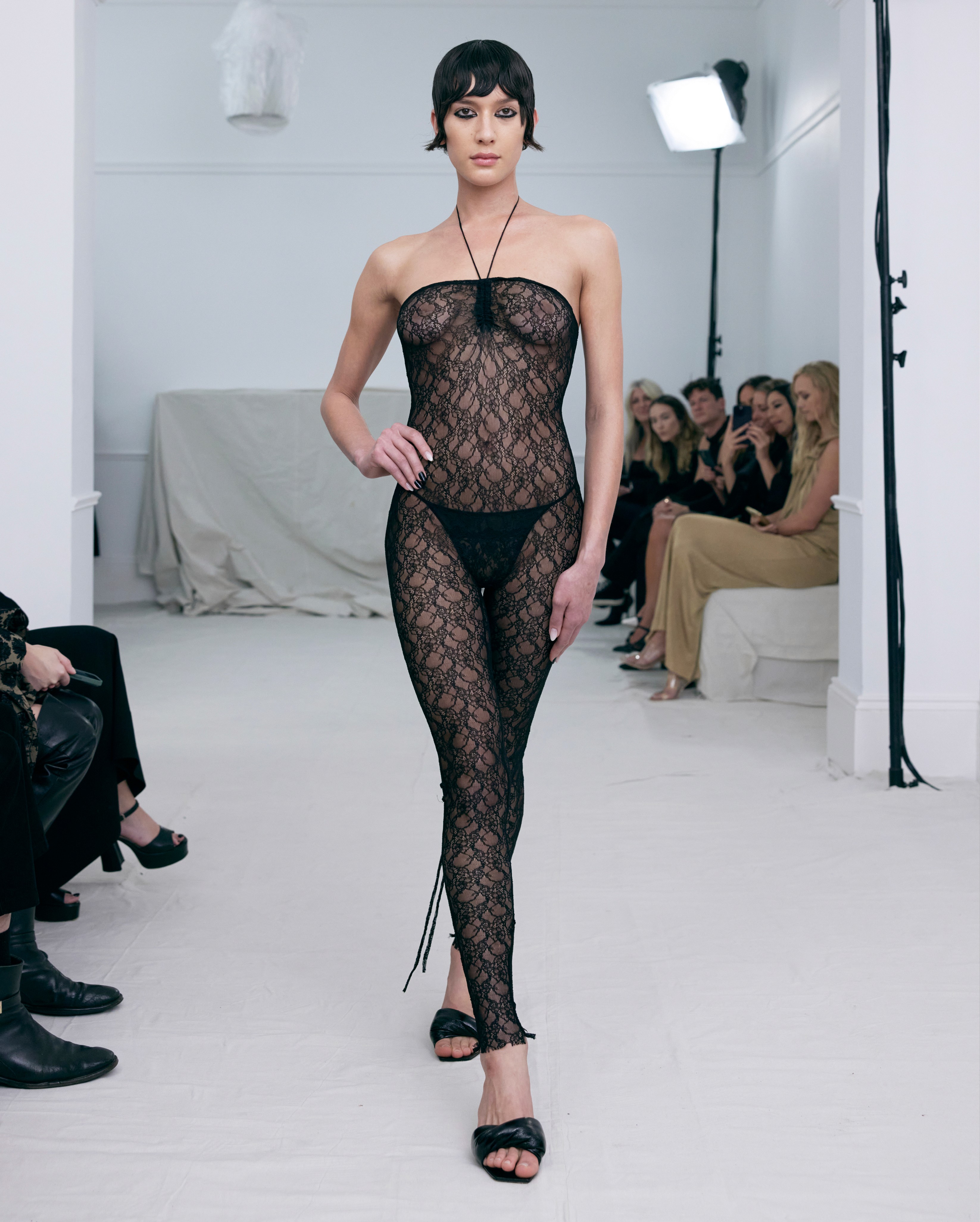The show direction, in partnership with RIZER Global, wrapped 8 Challis Avenue in a blank canvas, providing a bold contrast to Alleycat's debauchery and suggesting a space perpetually under construction and evolution. Models moved through many rooms, some tightly packed, others with seating, channelling turn-of-the-century couture salons and punk fashion parties from the late '80s and early '90s. Clean, diffuse lighting made details and fabrics easy to see and photograph.