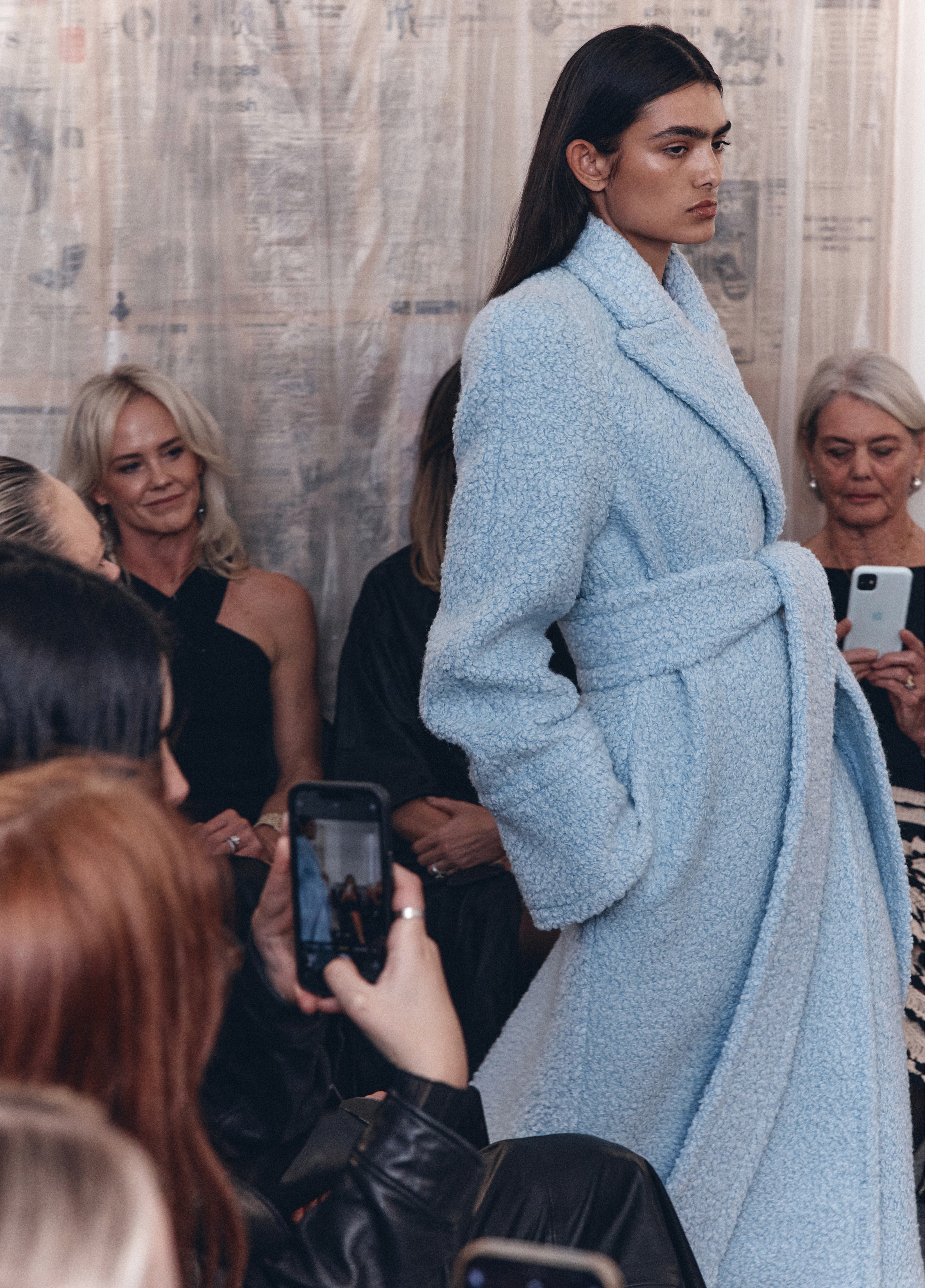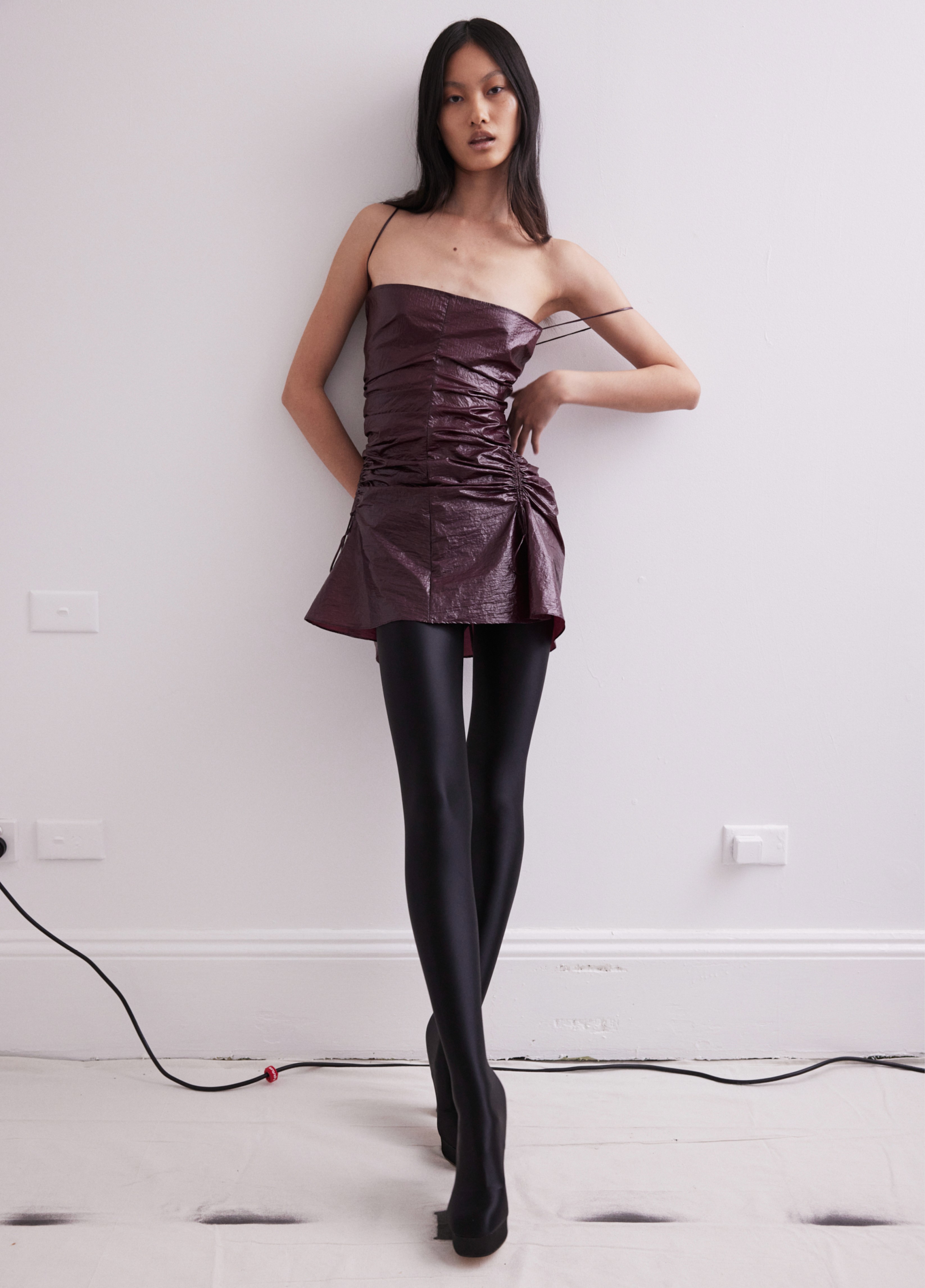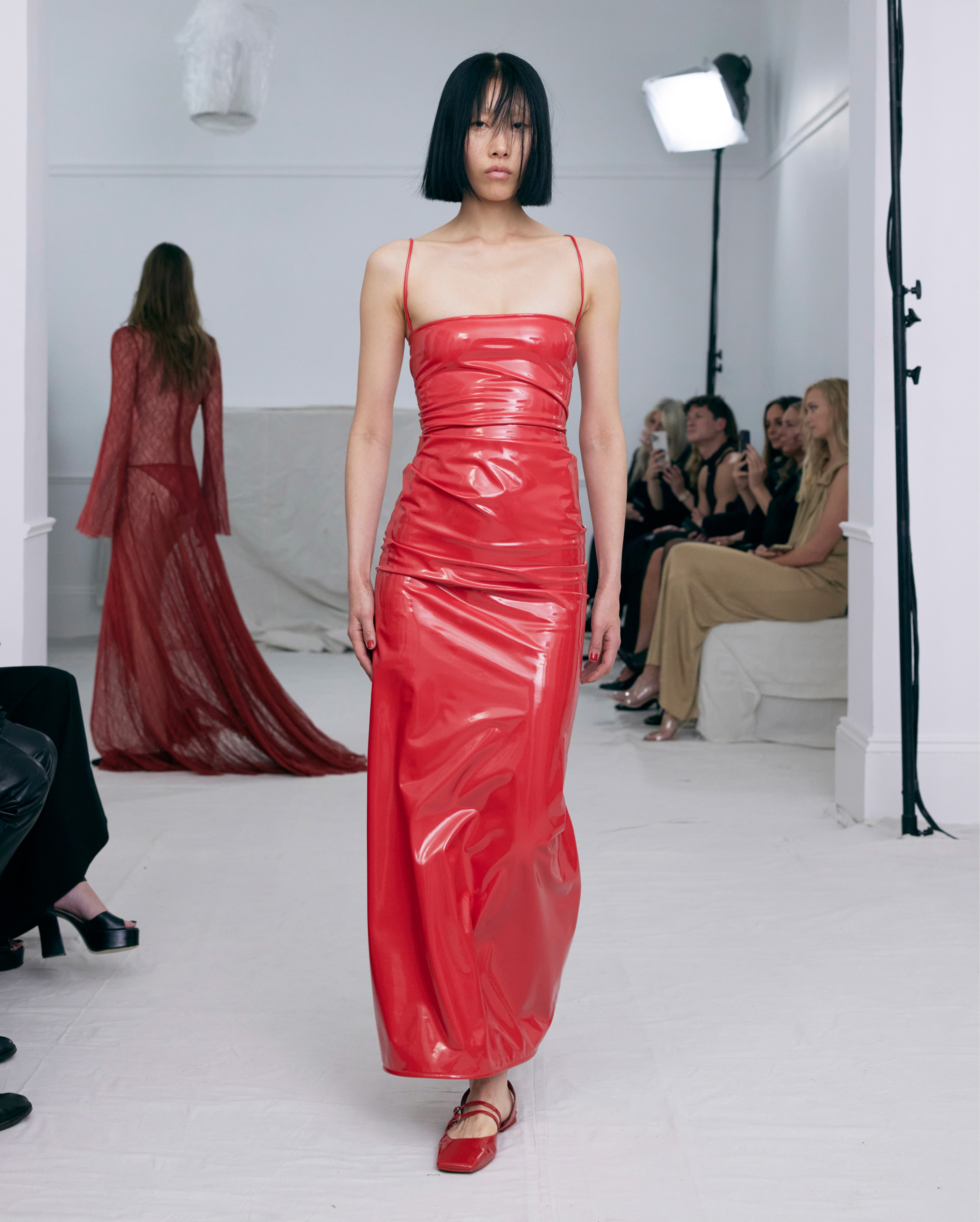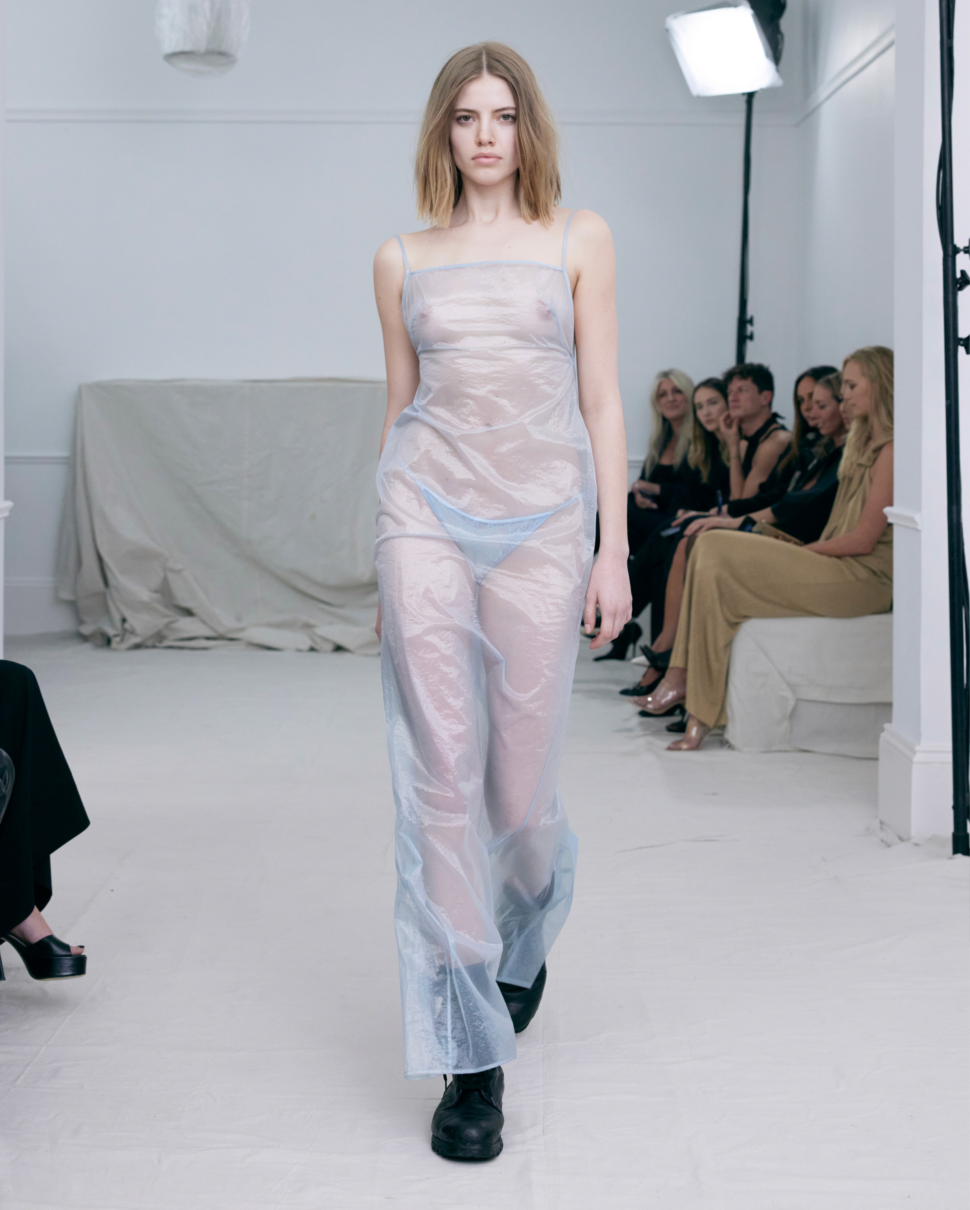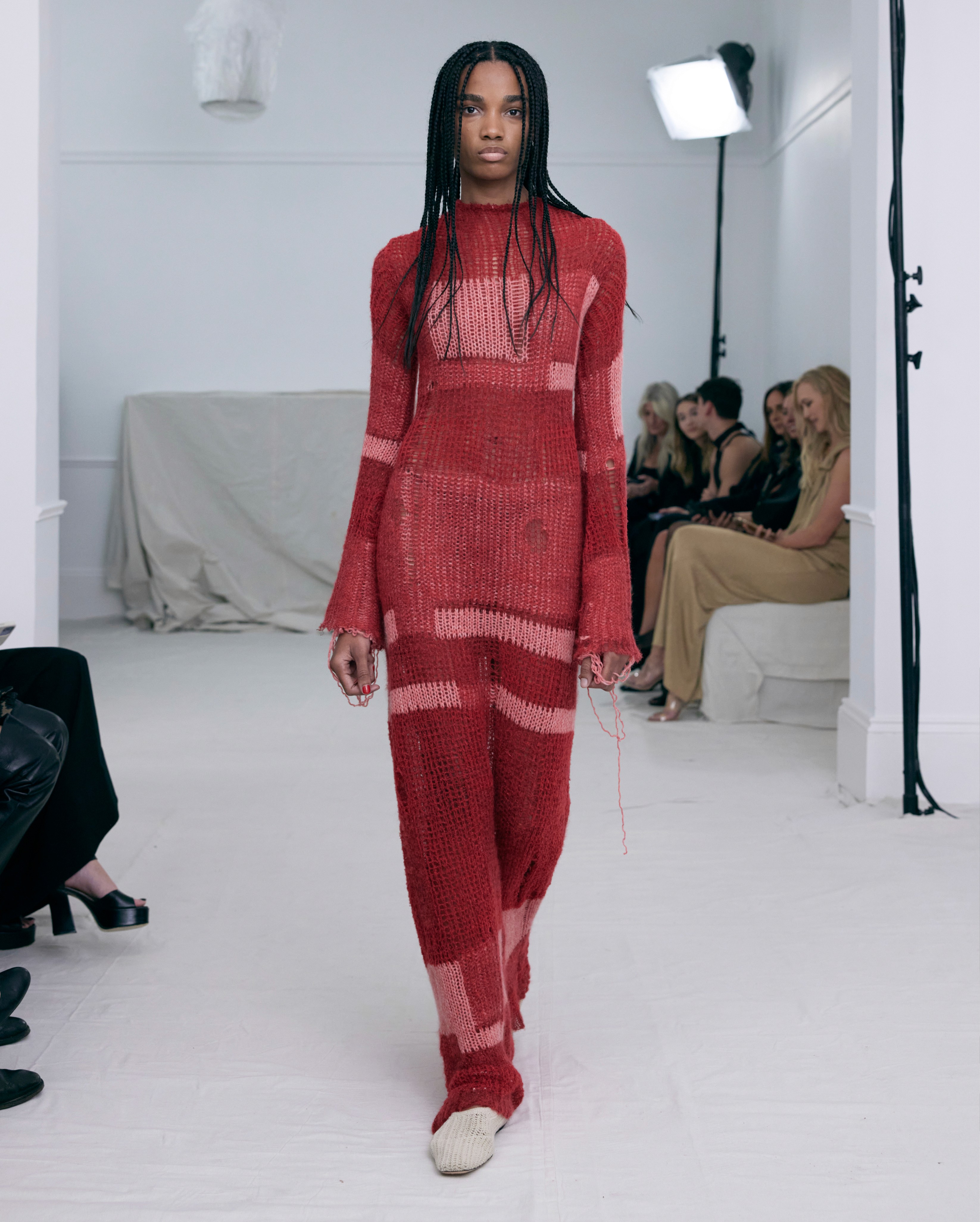 The show direction, in partnership with RIZER Global, wrapped 8 Challis Avenue in a blank canvas, providing a bold contrast to Alleycat's debauchery and suggesting a space perpetually under construction and evolution. Models moved through many rooms, some tightly packed, others with seating, channelling turn-of-the-century couture salons and punk fashion parties from the late '80s and early '90s. Clean, diffuse lighting made details and fabrics easy to see and photograph.