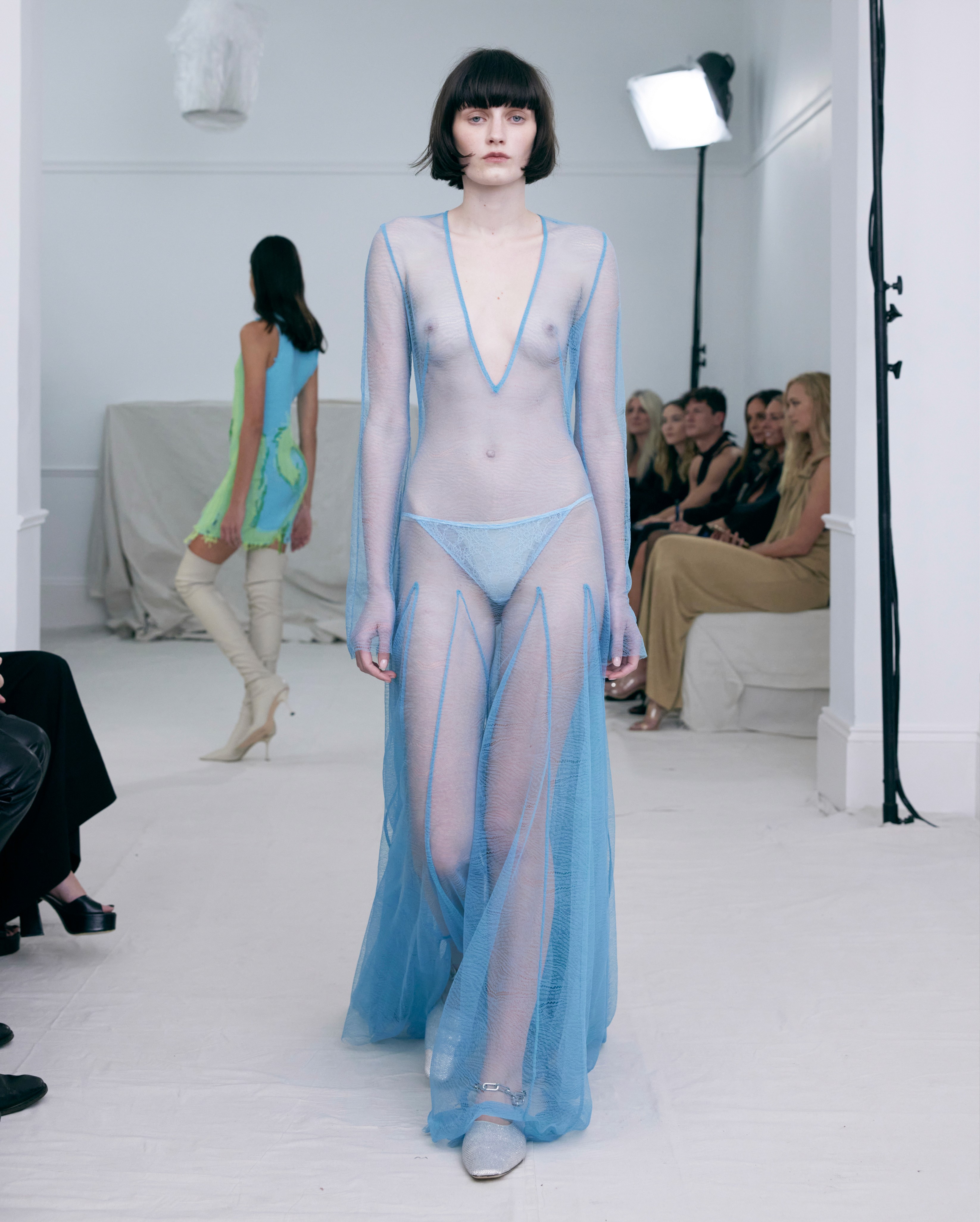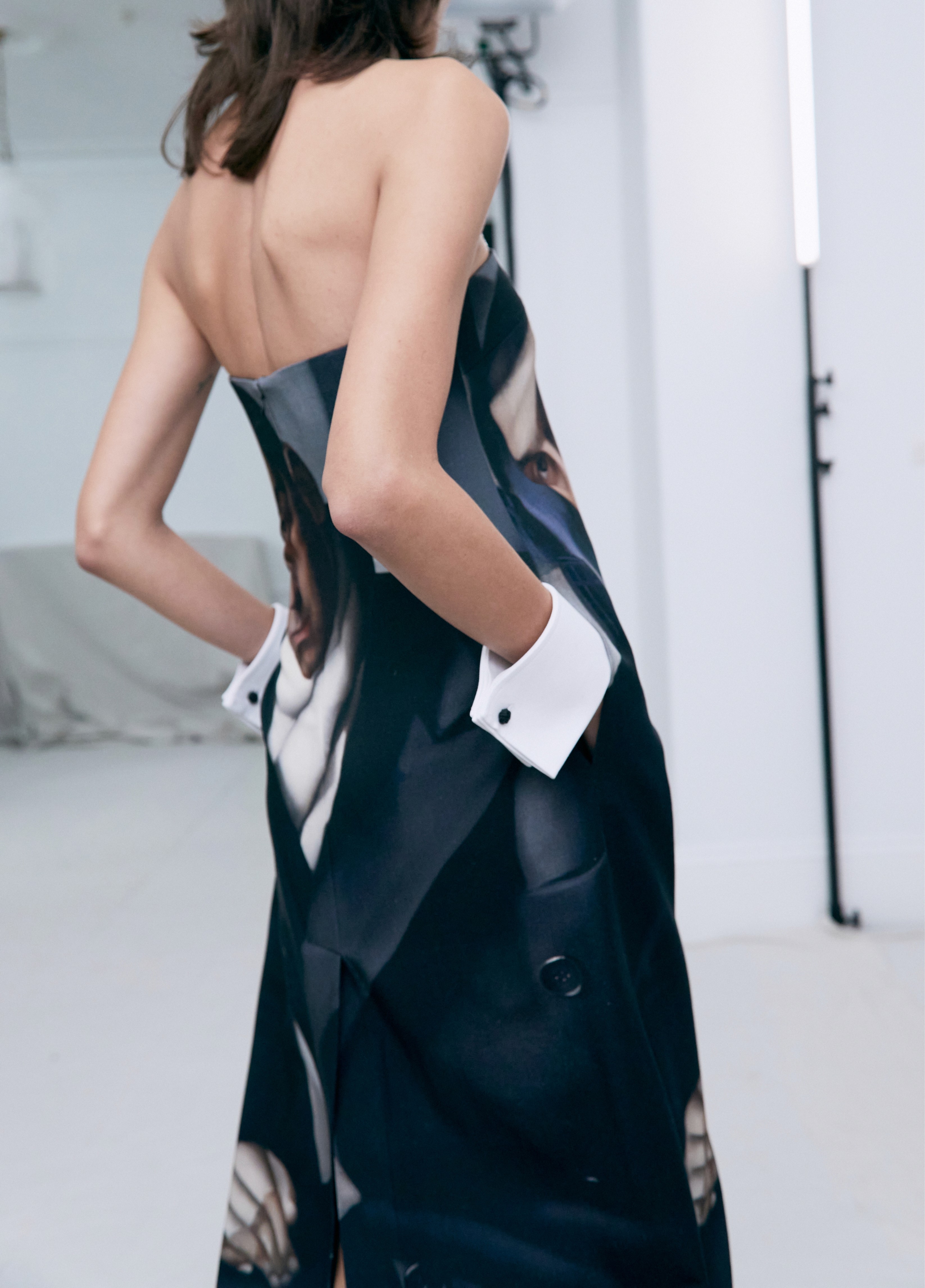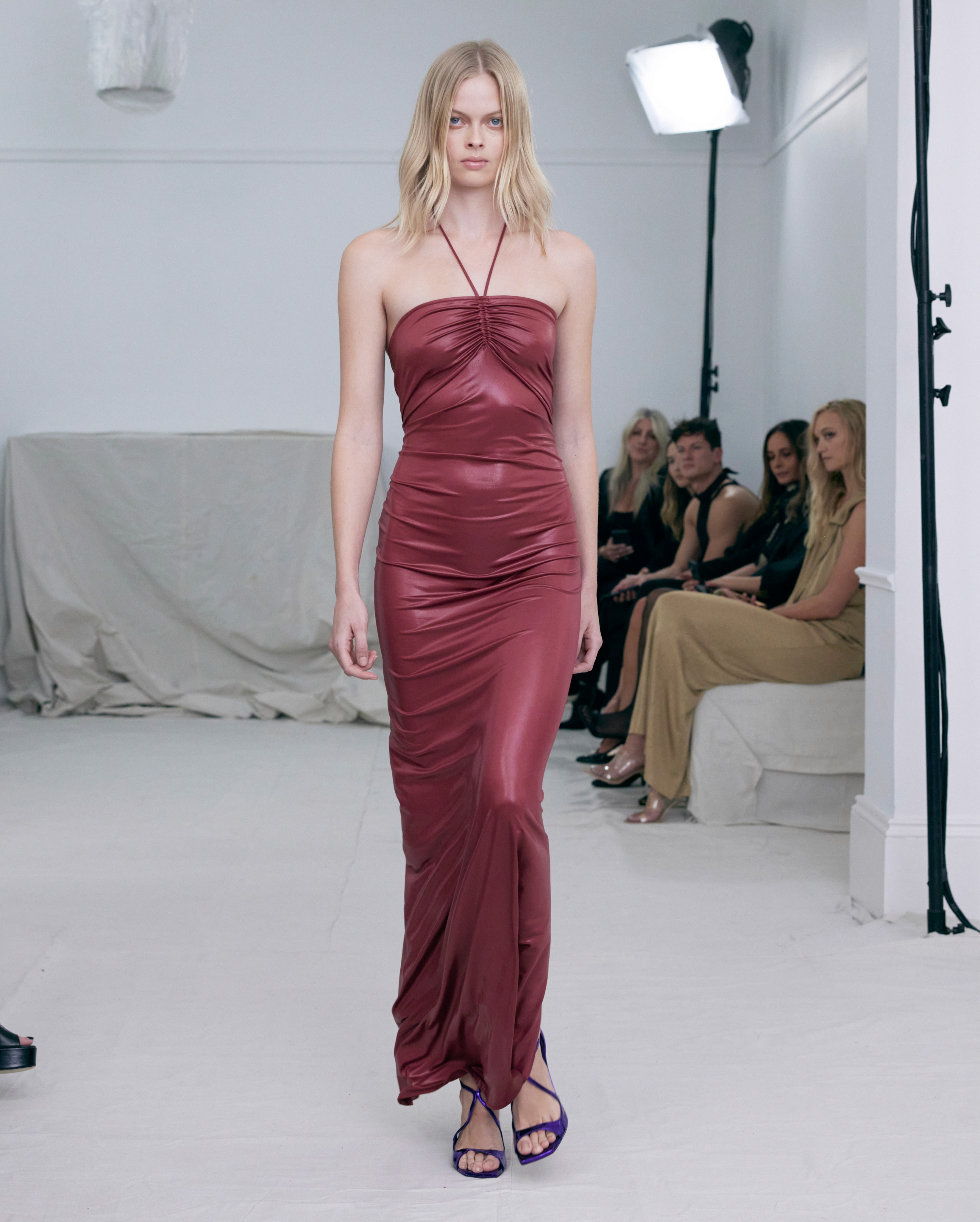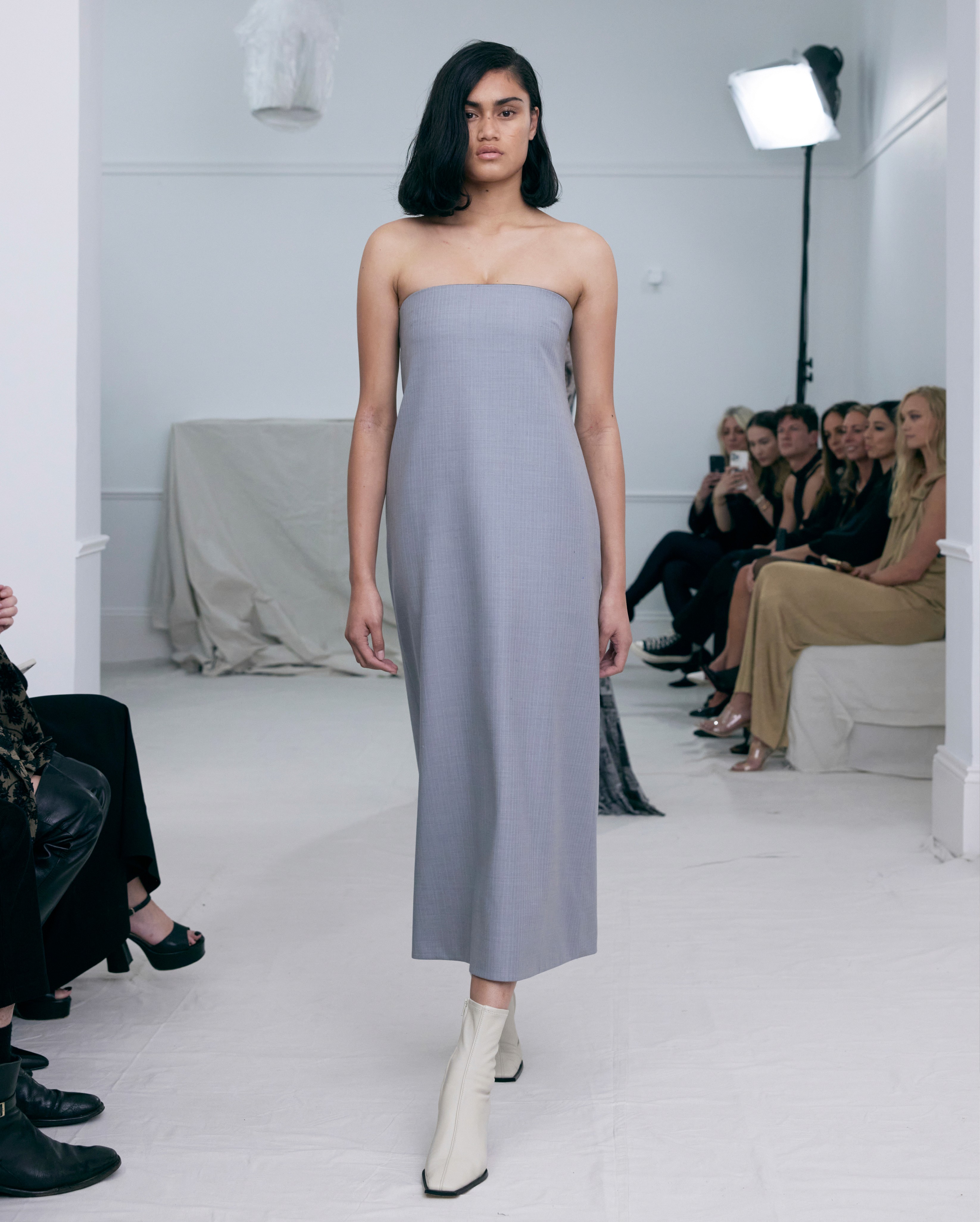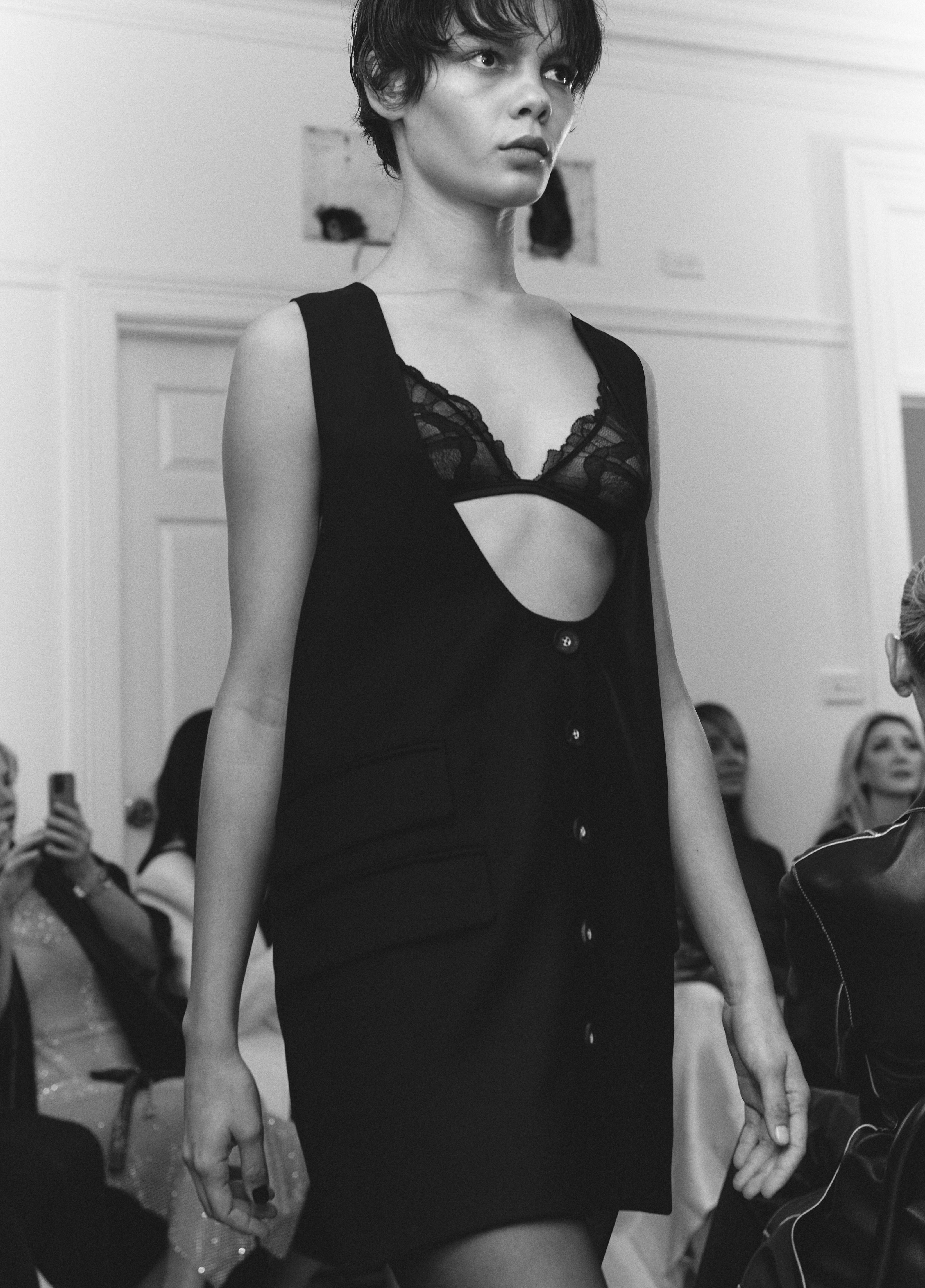 The show direction, in partnership with RIZER Global, wrapped 8 Challis Avenue in a blank canvas, providing a bold contrast to Alleycat's debauchery and suggesting a space perpetually under construction and evolution. Models moved through many rooms, some tightly packed, others with seating, channelling turn-of-the-century couture salons and punk fashion parties from the late '80s and early '90s. Clean, diffuse lighting made details and fabrics easy to see and photograph.