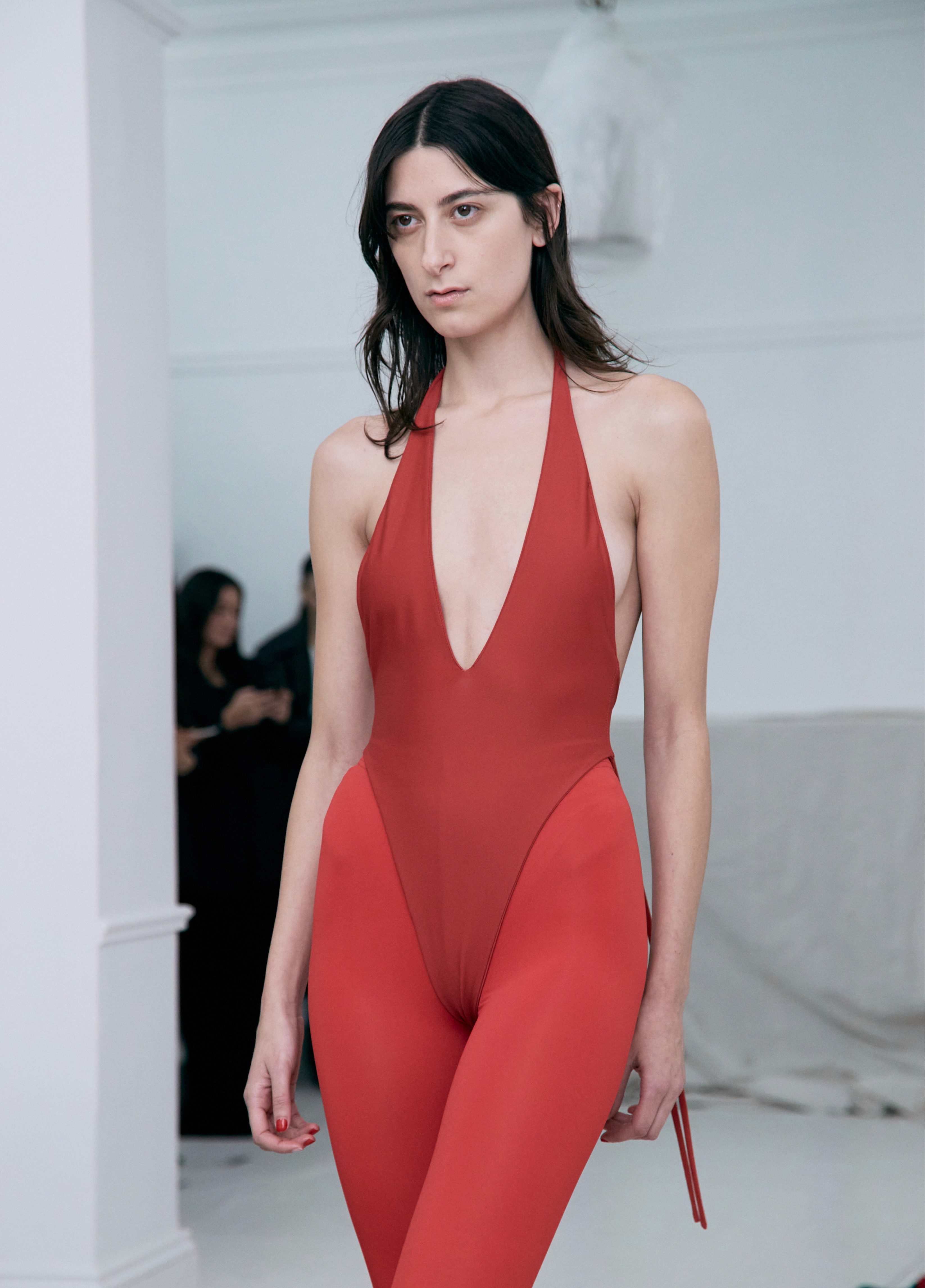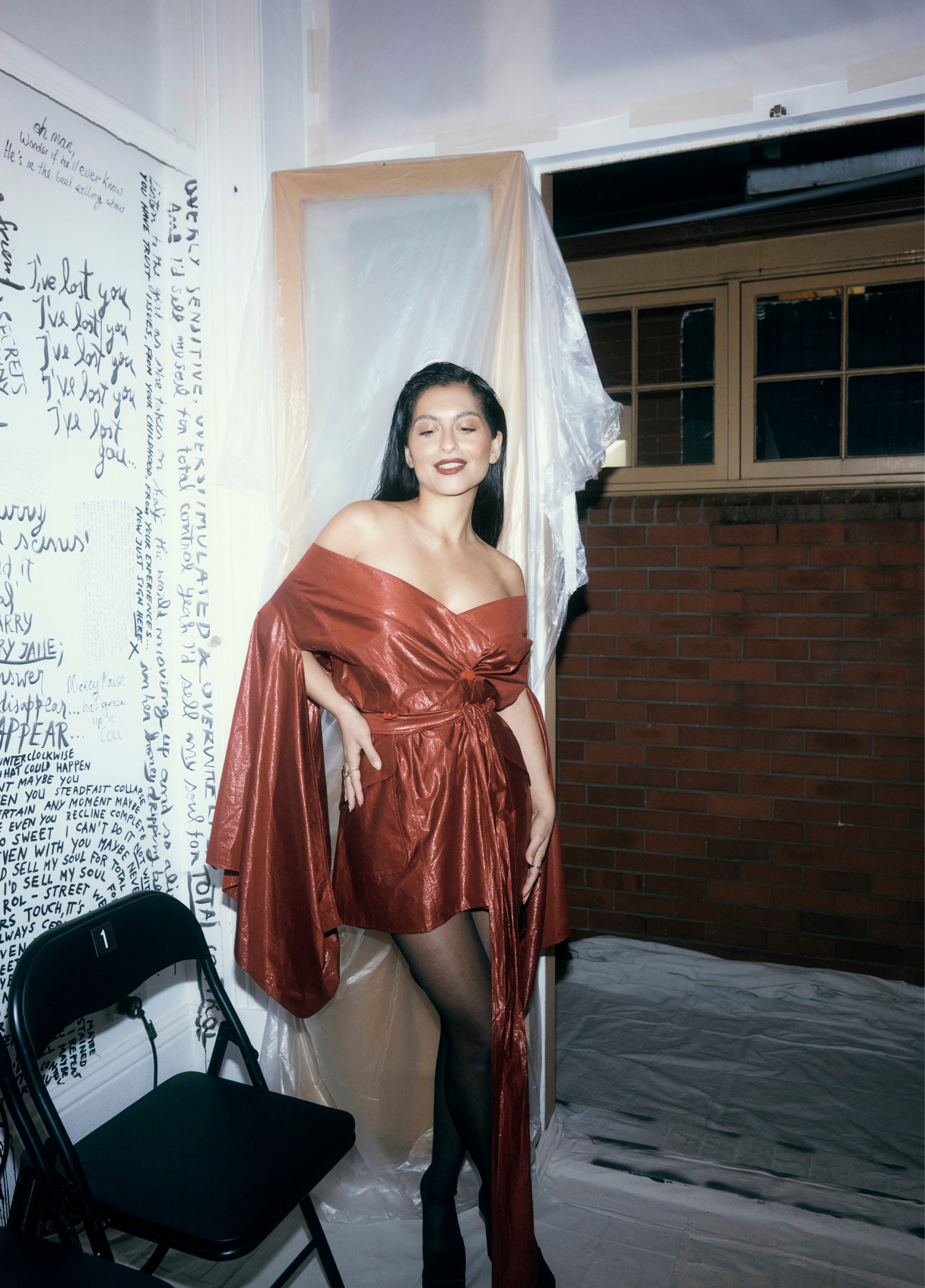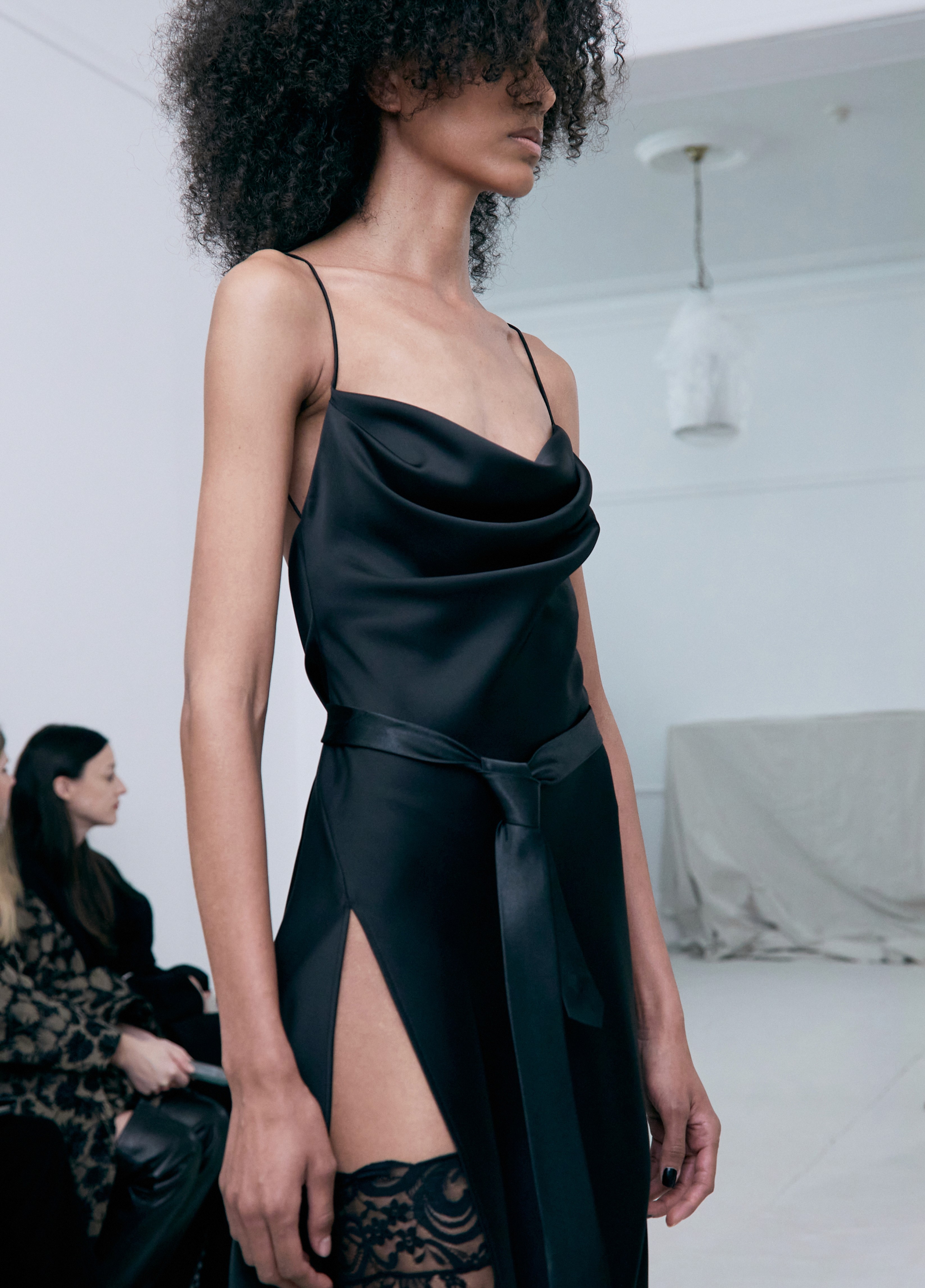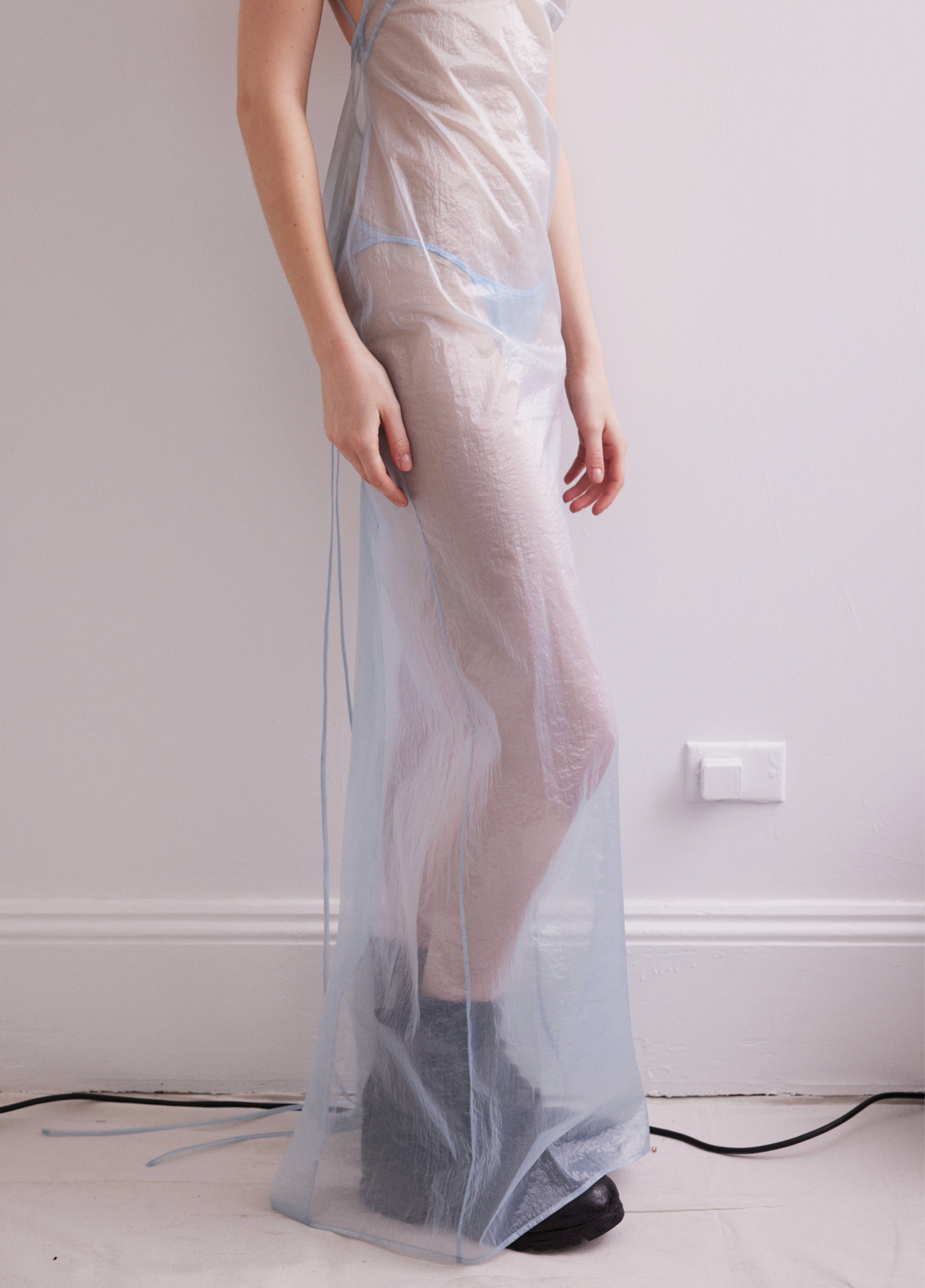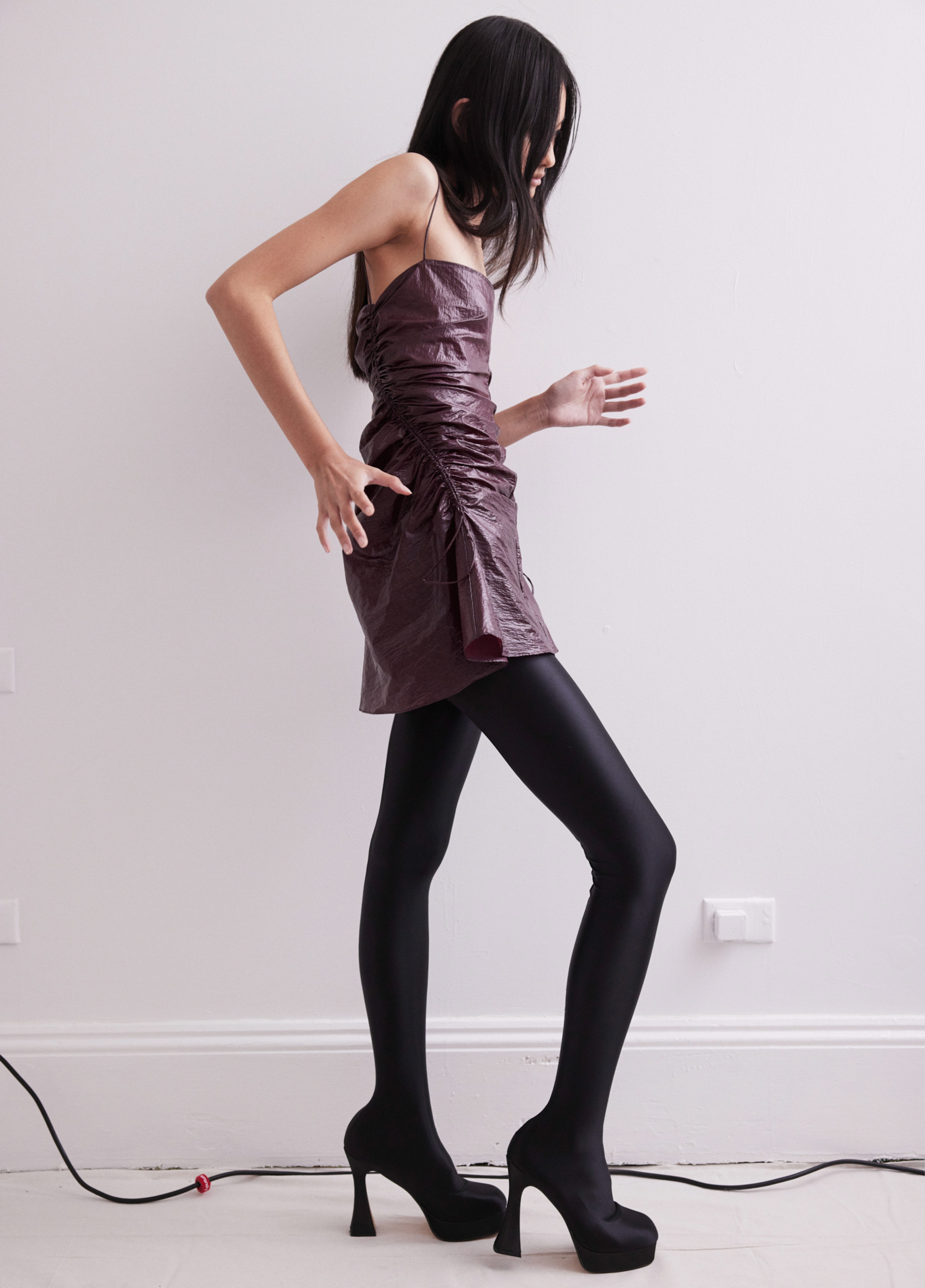The show direction, in partnership with RIZER Global, wrapped 8 Challis Avenue in a blank canvas, providing a bold contrast to Alleycat's debauchery and suggesting a space perpetually under construction and evolution. Models moved through many rooms, some tightly packed, others with seating, channelling turn-of-the-century couture salons and punk fashion parties from the late '80s and early '90s. Clean, diffuse lighting made details and fabrics easy to see and photograph.