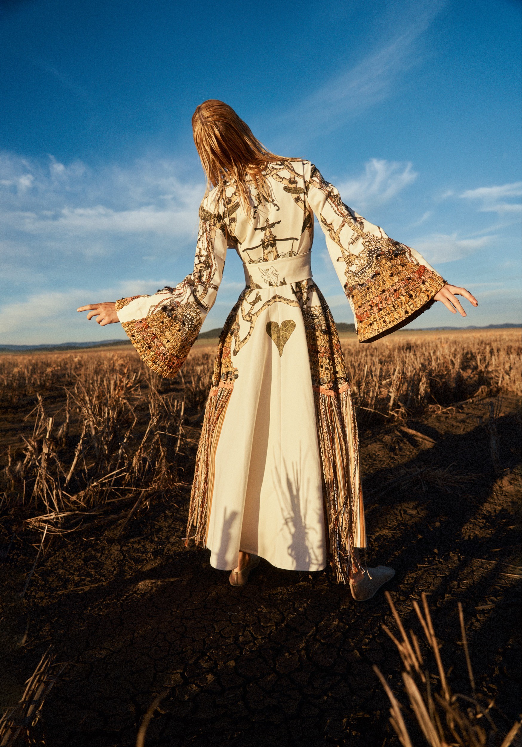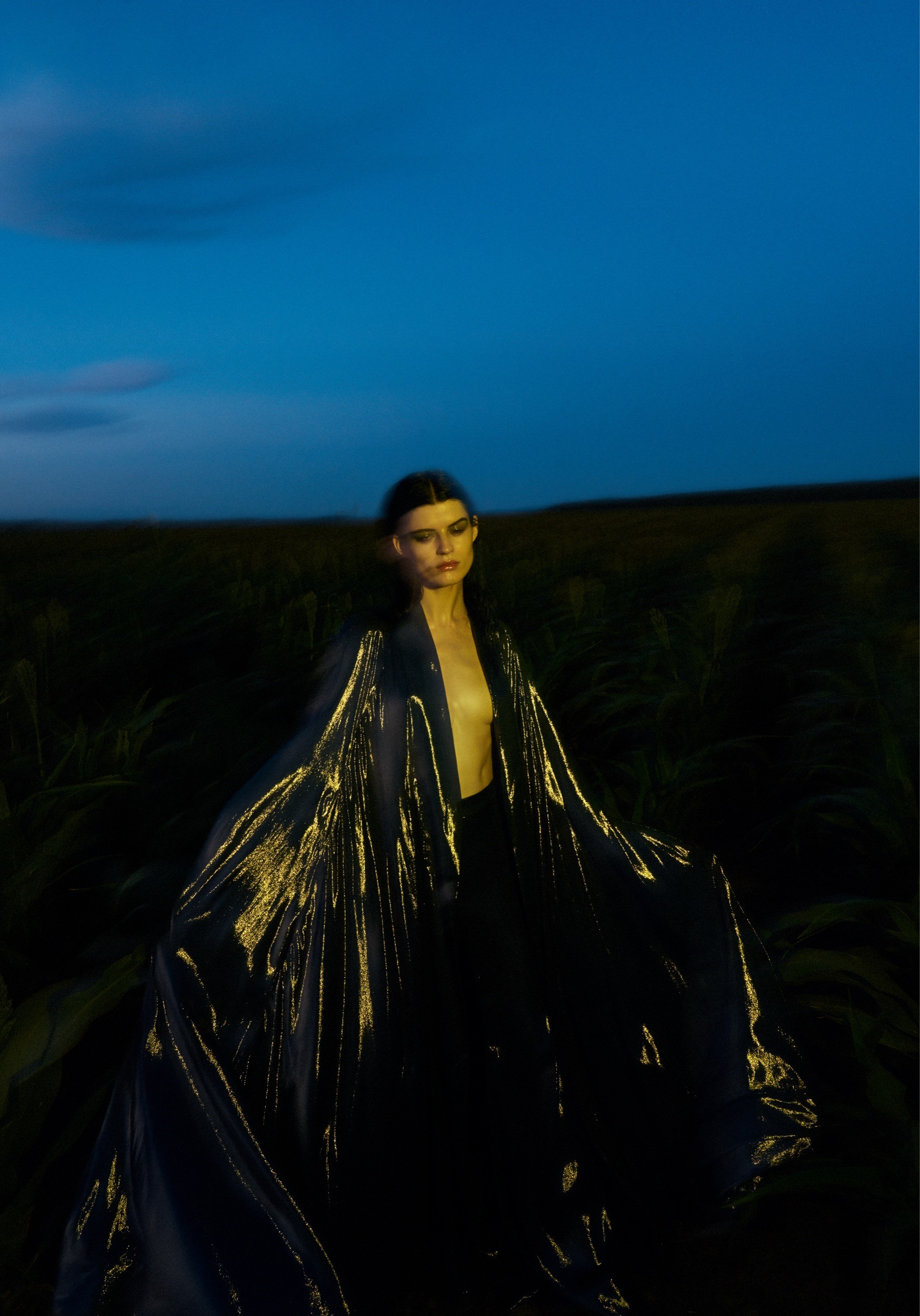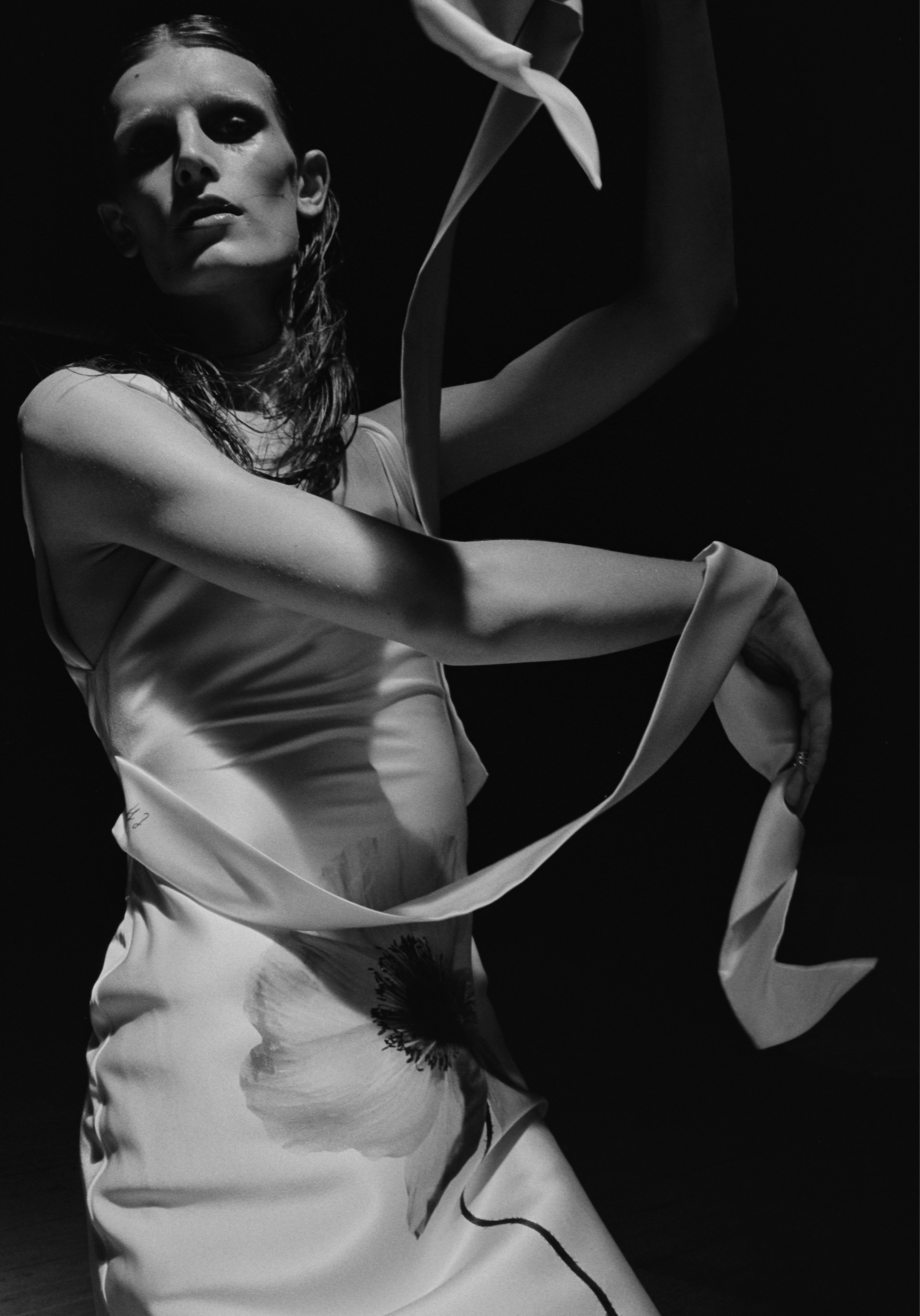 Our often alien-like natural world inspired the collection. In the campaign, a sense of exhilaration pervades: these are clothes for brighter times, a signal of renewal and optimism, sometimes shocking and disruptive, other times reflective and restrained. The campaign's characters appear in this world alone, otherworldly creatures in an inhospitable land where the earth is scorched and cracked. They stand tall, unperturbed, oddities in the searing heat. The horizon is endless, the world bright with blinding light. Suddenly, dark. Wooden shutters close in, the darkness of night. From the parched land, wetness now appears, luscious and opulent. A sense of urgency, immediacy, ecstasy. An imperative need for action. Chaos and rapture explode in perpetual dance and never-ending motion: flowers bloom, a succulent jolt of possibility.
