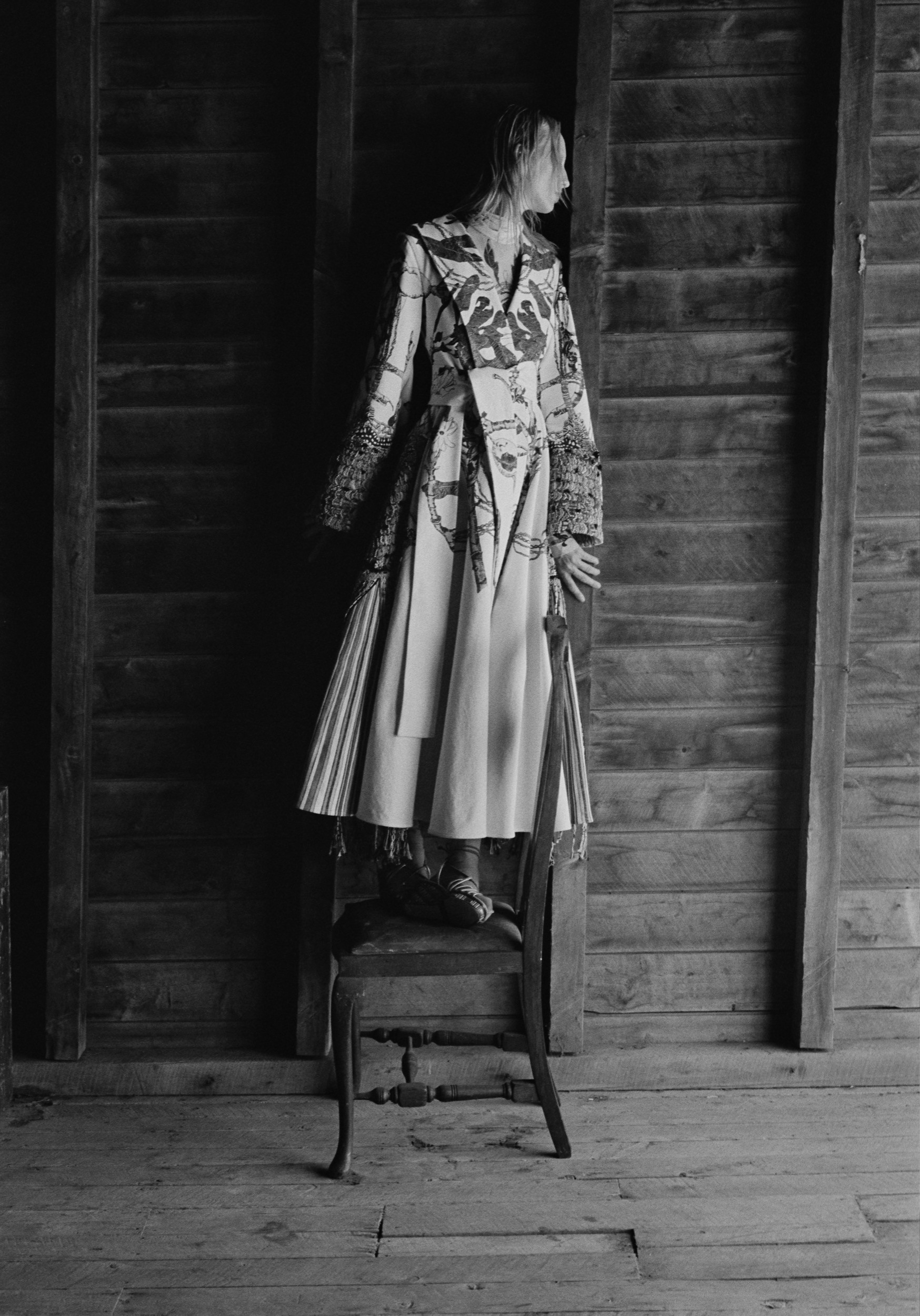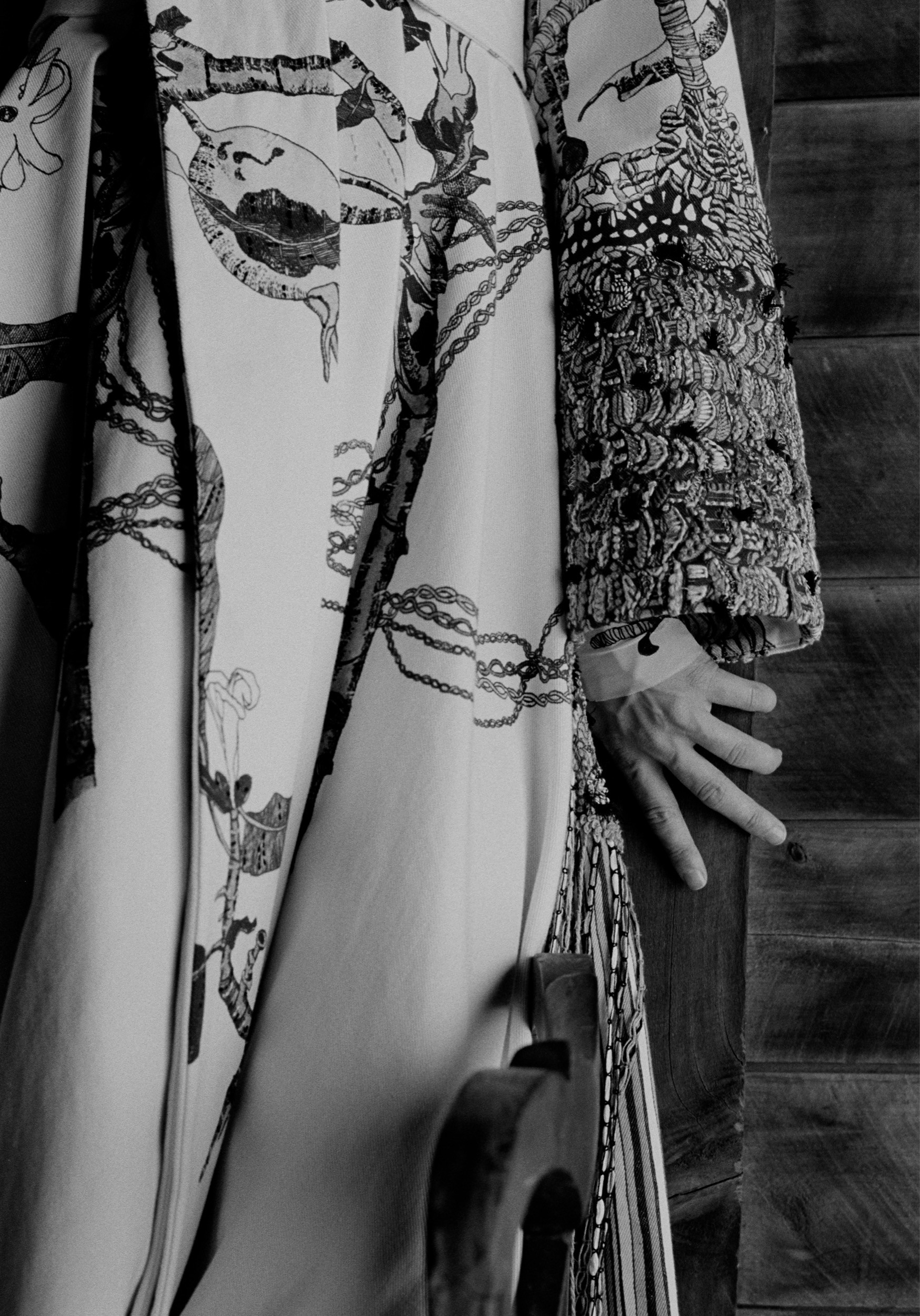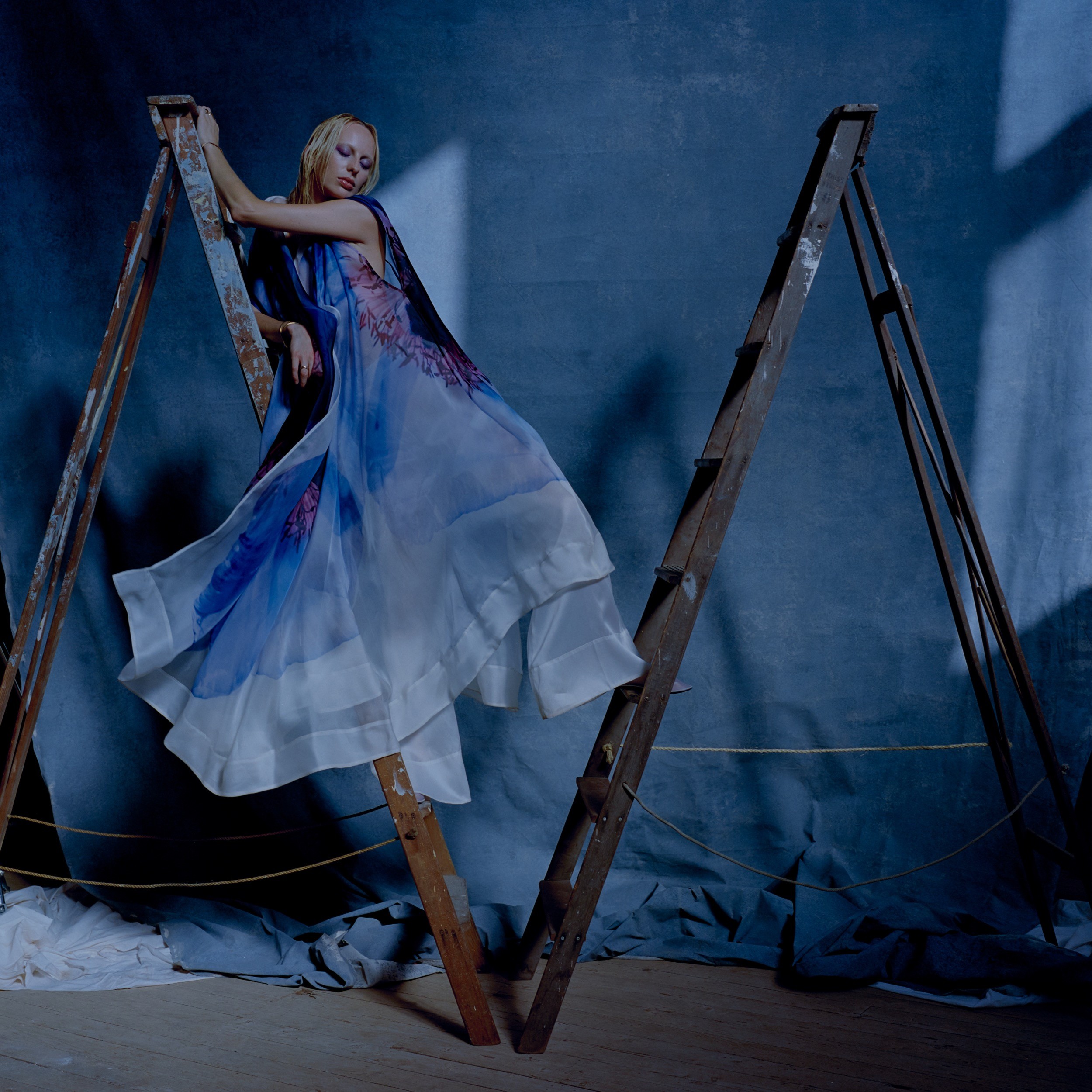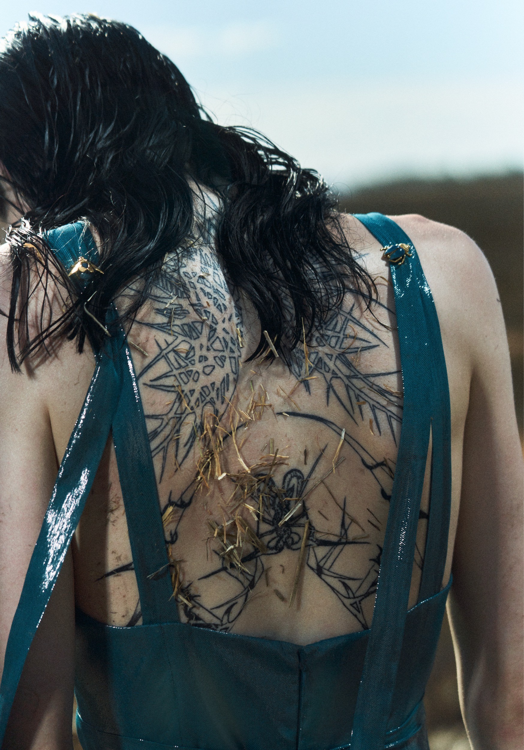Our often alien-like natural world inspired the collection. In the campaign, a sense of exhilaration pervades: these are clothes for brighter times, a signal of renewal and optimism, sometimes shocking and disruptive, other times reflective and restrained. The campaign's characters appear in this world alone, otherworldly creatures in an inhospitable land where the earth is scorched and cracked. They stand tall, unperturbed, oddities in the searing heat. The horizon is endless, the world bright with blinding light. Suddenly, dark. Wooden shutters close in, the darkness of night. From the parched land, wetness now appears, luscious and opulent. A sense of urgency, immediacy, ecstasy. An imperative need for action. Chaos and rapture explode in perpetual dance and never-ending motion: flowers bloom, a succulent jolt of possibility.